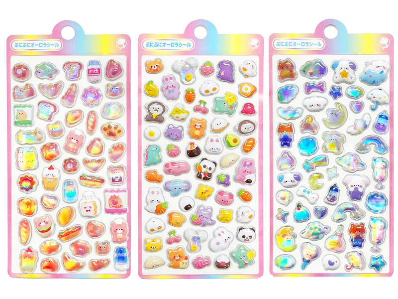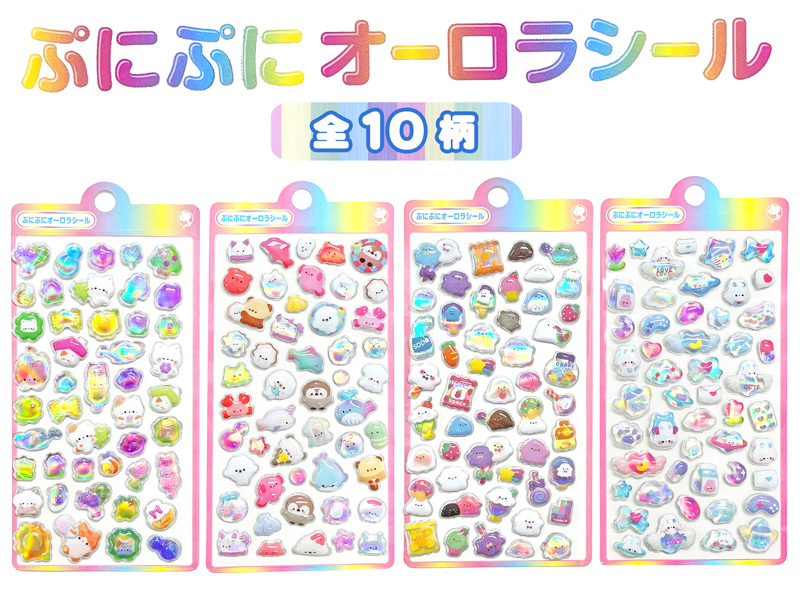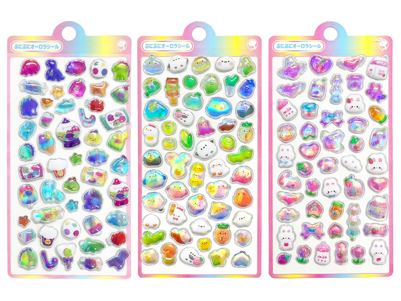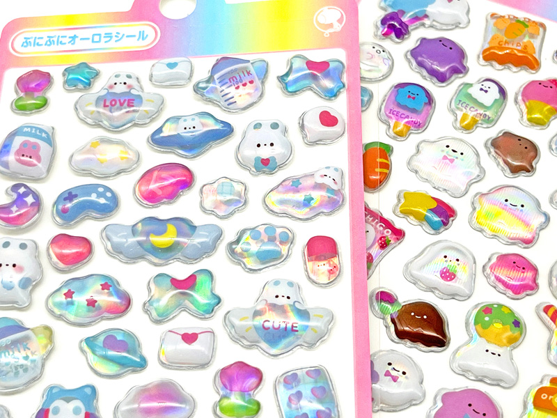 いま話題のぷっくりシールに「ぷにぷにオーロラシール」が新入荷!商品名には『ぷにぷに』とありますが表面はぷっくり、中は空洞でエアー感のある少し硬めの質感シールです。光りにあてるとオーロラのように色とりどりに輝いて見えます。シールの種類は全部で10種類!!立体的で存在感があり、貼るだけでデコレーションがぐっと華やかに!スマホや手帳、ノートなど、身の回りのアイテムを手軽にかわいくアレンジできます。おでかけ気分を盛り上げてくれる、かわいいキャラクターがいっぱい。集めて楽しい、使ってうれしいシールです。