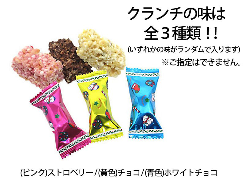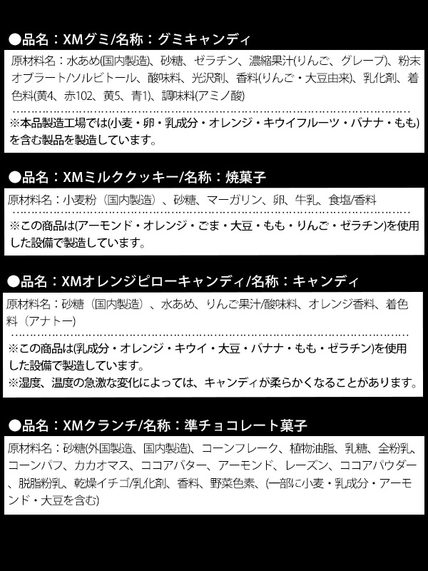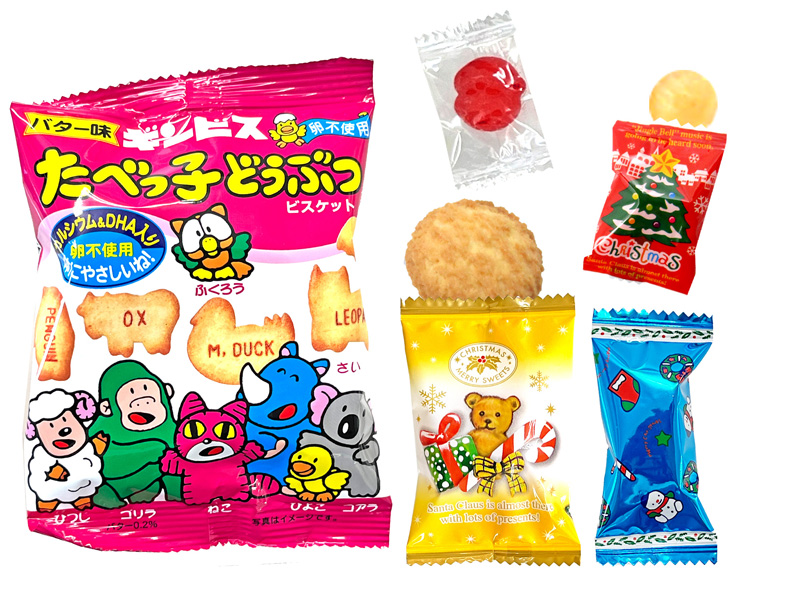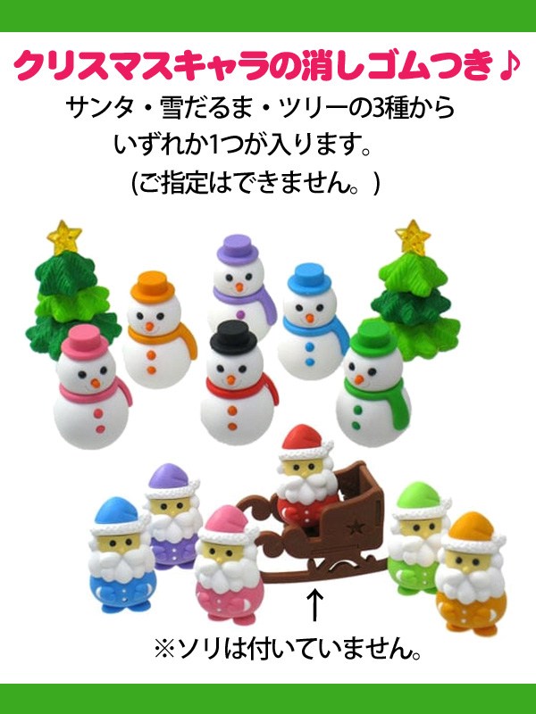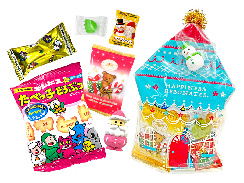 - セット内容…雑貨(クリスマス消しゴム×1種) お菓子(・XMミルククッキー×1・XMグミキャンディ×1・XMオレンジピローキャンディ×1・XMクランチ×1・たべっ子どうぶつ×1)