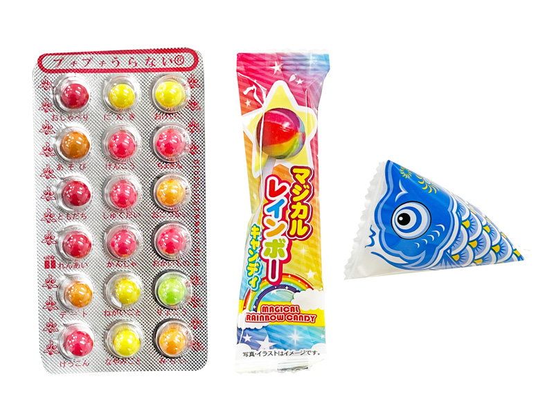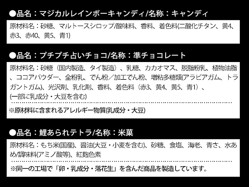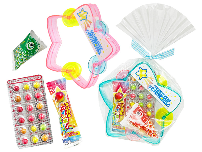 - セット内容:雑貨(タンバリン×1) お菓子(マジカルレインボー×1・鯉あられ×1・プチプチ占いチョコ×1)