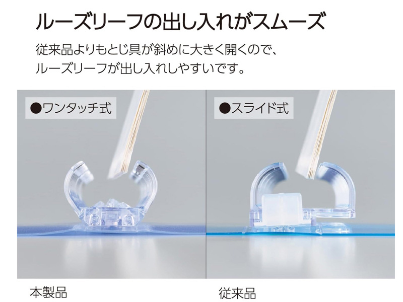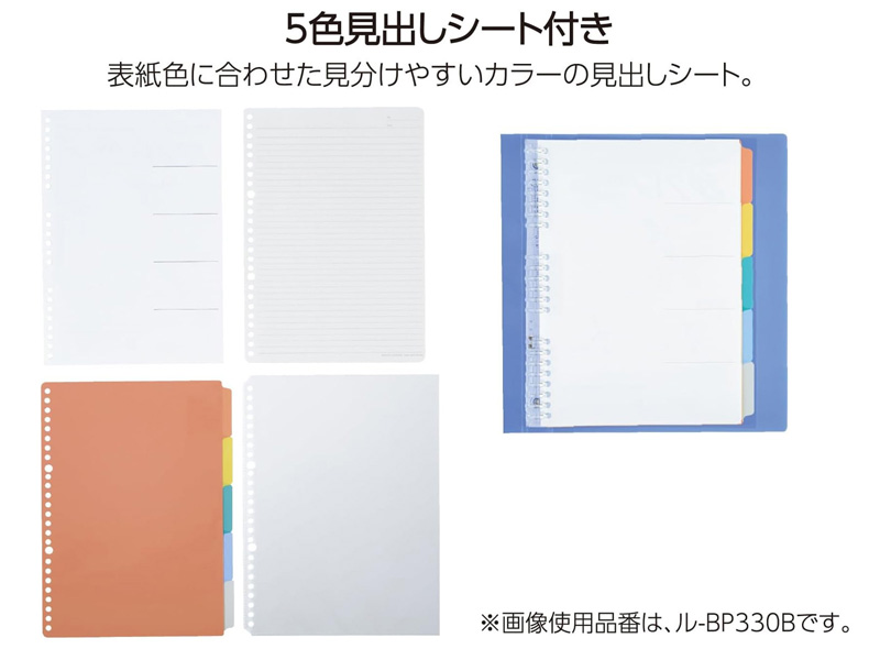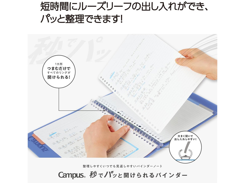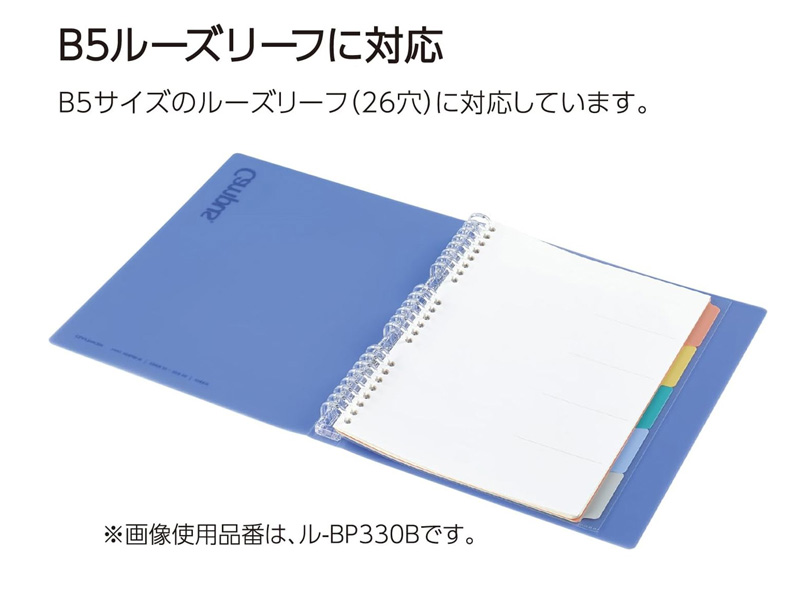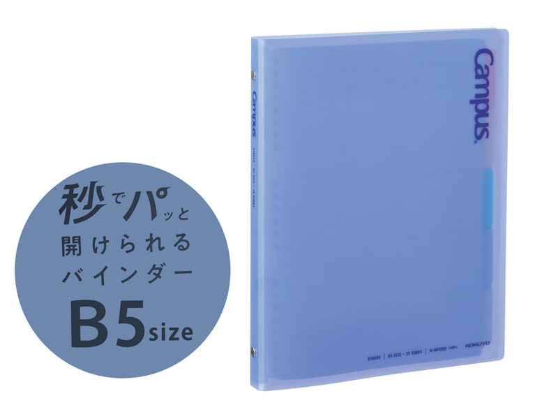 リングが秒でパッと開く!つまむだけで開けられる!B5サイズのルーズリーフバインダーが登場。〈商品の特徴〉・綴じ具が大きく開いて中紙の差し替えもスムーズ。・B5サイズ(26穴)のルーズリーフに対応しています。・表紙に合わせた見分けやすいカラーリングのインデックス(5枚)付き。・プリントが整理できるクリヤーポケット(1枚)付き。