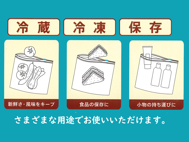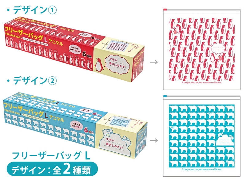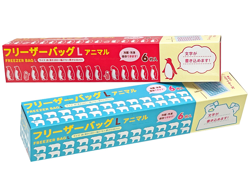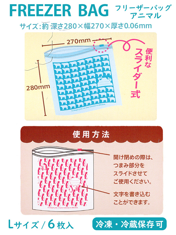 食品を入れて冷凍・冷蔵ができるスライダー式のバッグです。バッグは白クマ、ペンギンのかわいいアニマル柄。♪袋の口は開け閉めに便利なスライダー式、内容量はLサイズ6枚入りです。