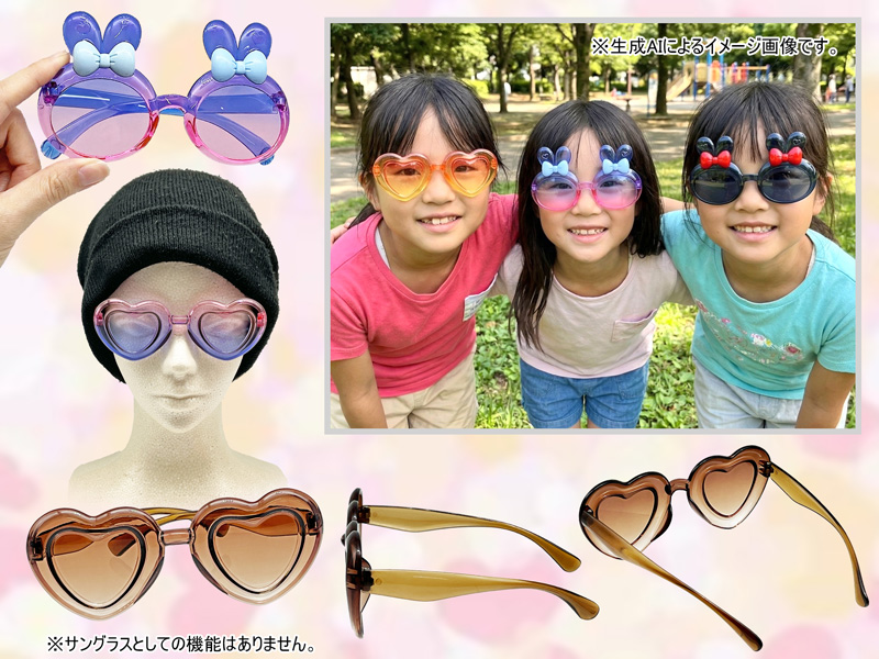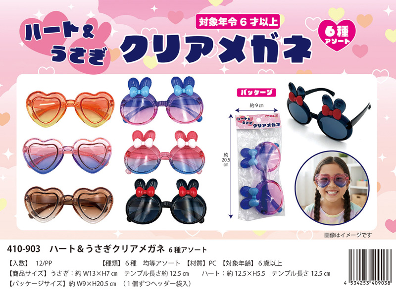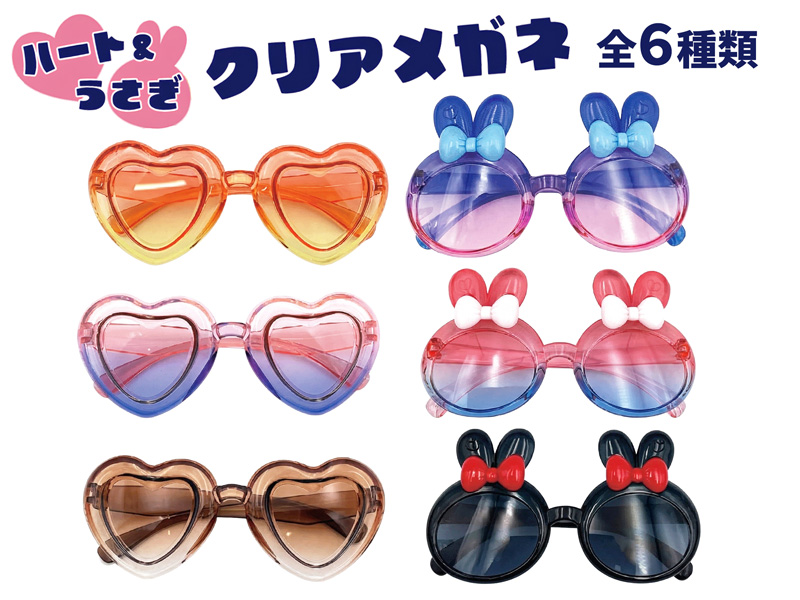 フレームがハートとウサギのカタチになった眼鏡…その名も『ハート&うさぎクリアメガネ』が登場~♪本体のデザインは全6種類。個別包装されておりますので、イベント景品などにもおすすめです。