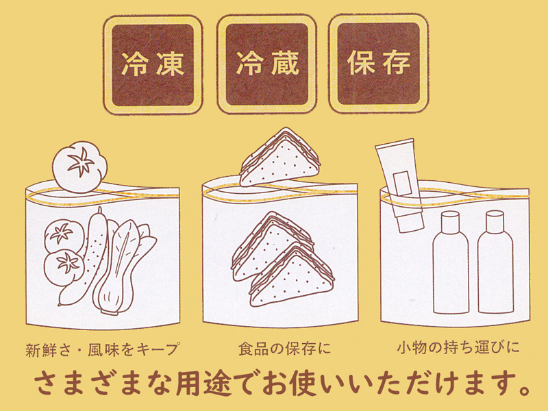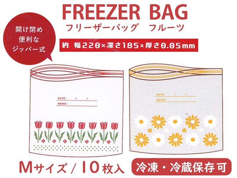 食品を入れて冷凍・冷蔵ができるジップ式のバッグです。ジップバッグはどこか懐かしいレトロなフラワーデザイン♪袋の口はしっかりと閉められるWジップタイプ。内容量はMサイズ10枚入りです。
