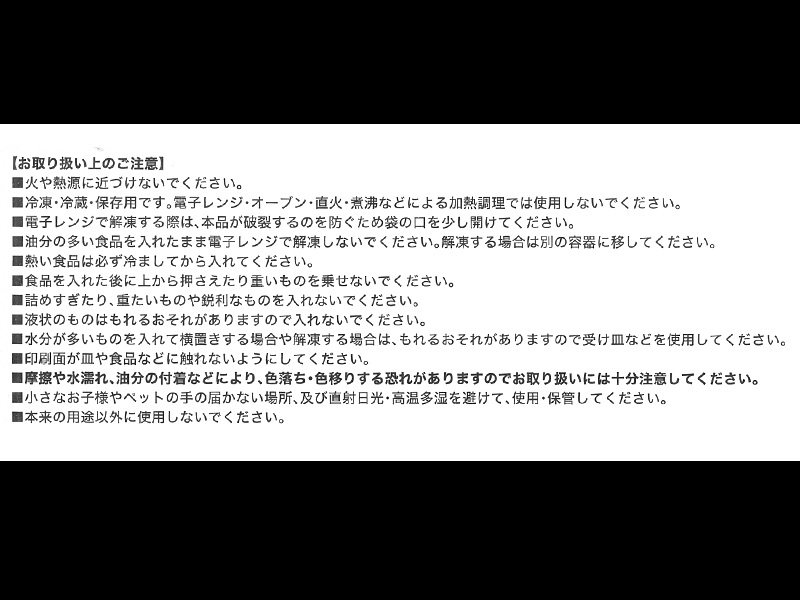 - ・冷凍庫・冷蔵保存専用です。オーブン・電子レンジ・直火などによる加熱調理では使用しないでください。