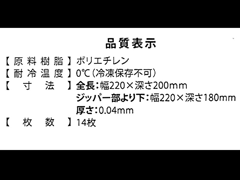 ジップバッグ(全長):約H200×W220/(ジッパーより下):約H180×W220×D0.04mm