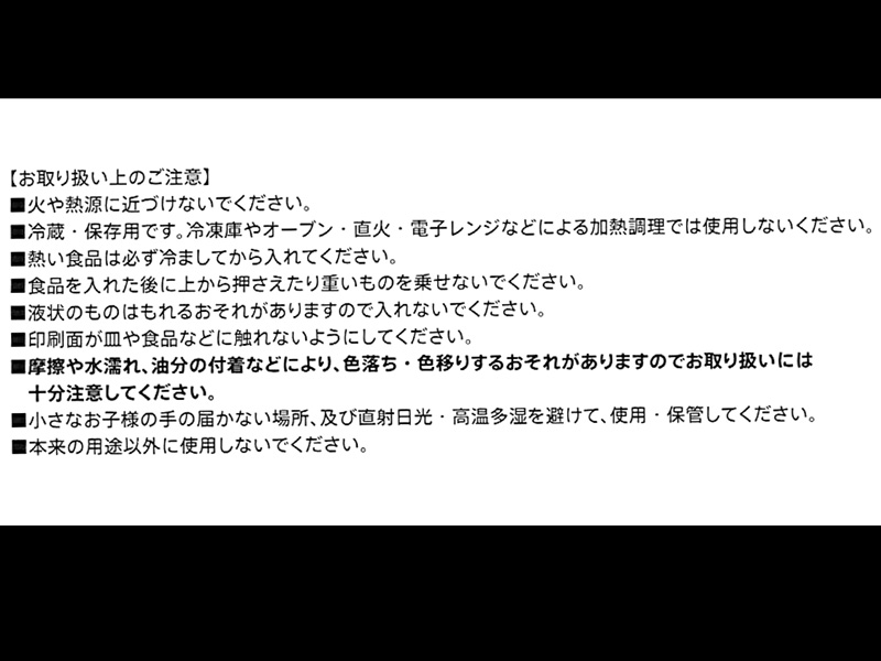 - ・冷蔵保存専用です。冷凍庫での保存やオーブン・電子レンジ・直火などによる加熱調理では使用しないでください。