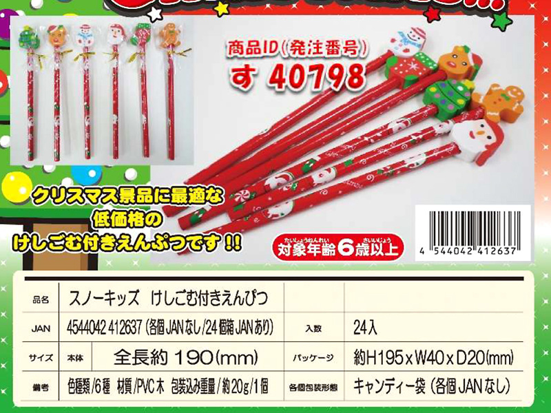 クリスマス景品にピッタリな「スノーキッズ消しゴム付き鉛筆」です。クリスマス柄の鉛筆の先には、サンタさんやトナカイのでっかい消しゴムがついていて鉛筆と消しゴムは簡単に取外しが可能です。クリスマスのイベントに参加した人へのプレゼント景品にいかがですか?