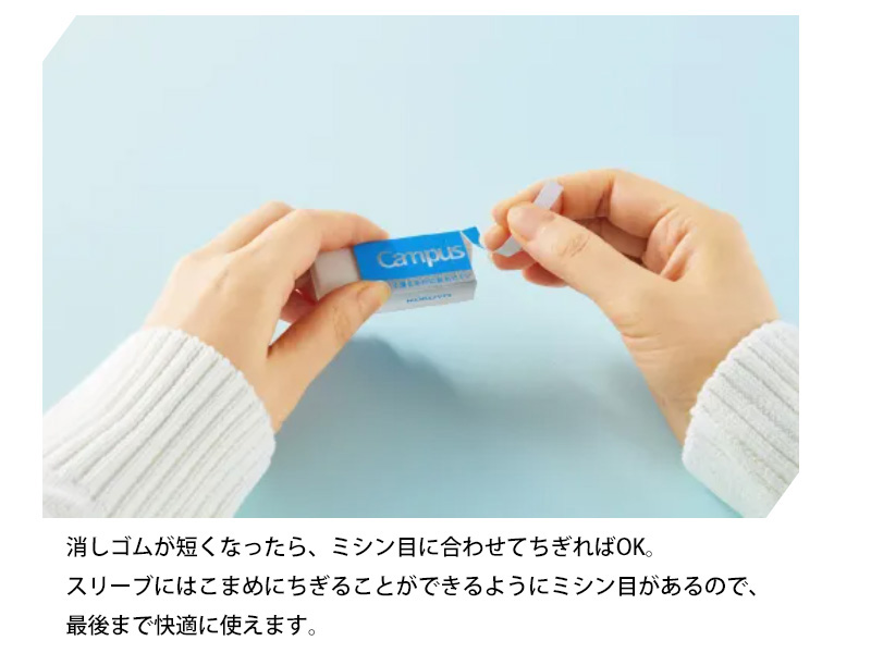 Campusの『よく消えるのに折れにくい消しゴム/平行四辺形』が登場!特長…軽い力できれいに消せるから、集中力を切らさずにサッと消すことができます。コクヨ独自のハイブリッド製法で、消しやすさと折れにくさの両立を実現しました。持ち方や消したい場所に合わせてフィットするので、広い面も細かい修正も、狙って消すことができます。消しゴムが短くなったら、ミシン目に合わせてちぎればOK。スリーブにはこまめにちぎることができるようにミシン目があるので、最後まで快適に使えます。