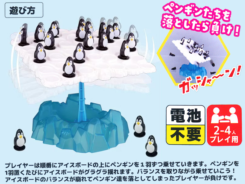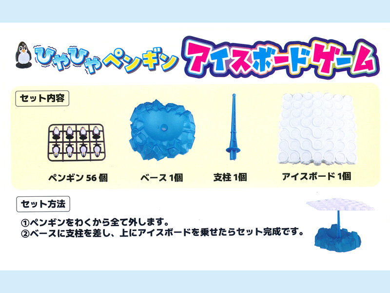 - セット内容:ベース×1、支柱1本、アイスボード×1個、ペンギン×56個