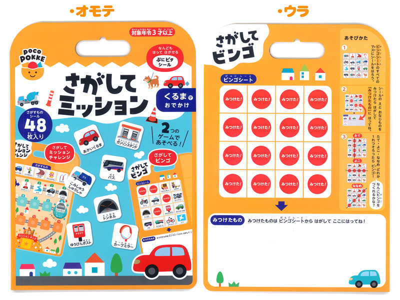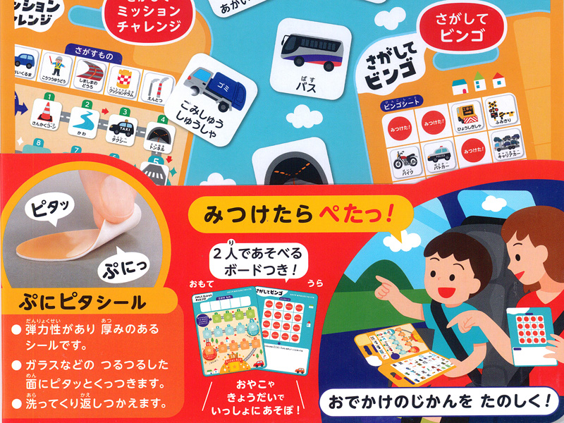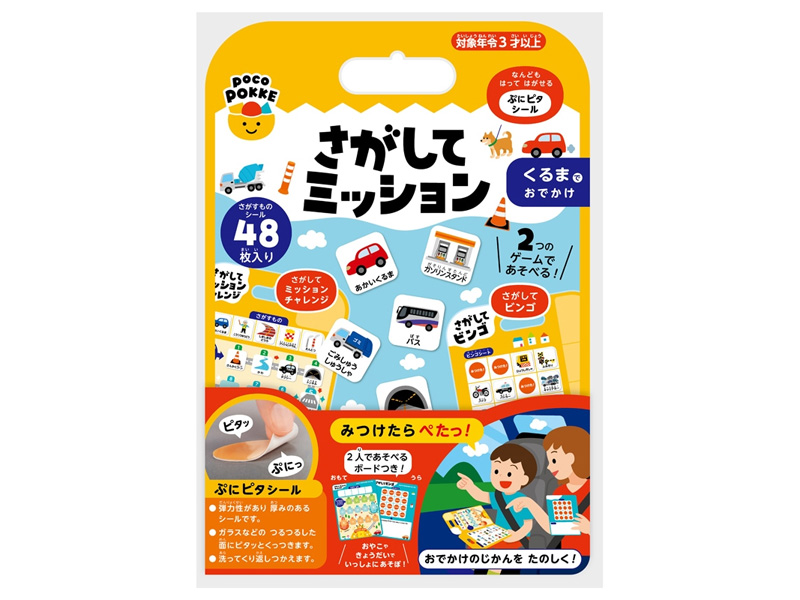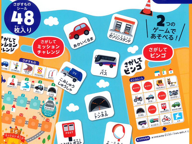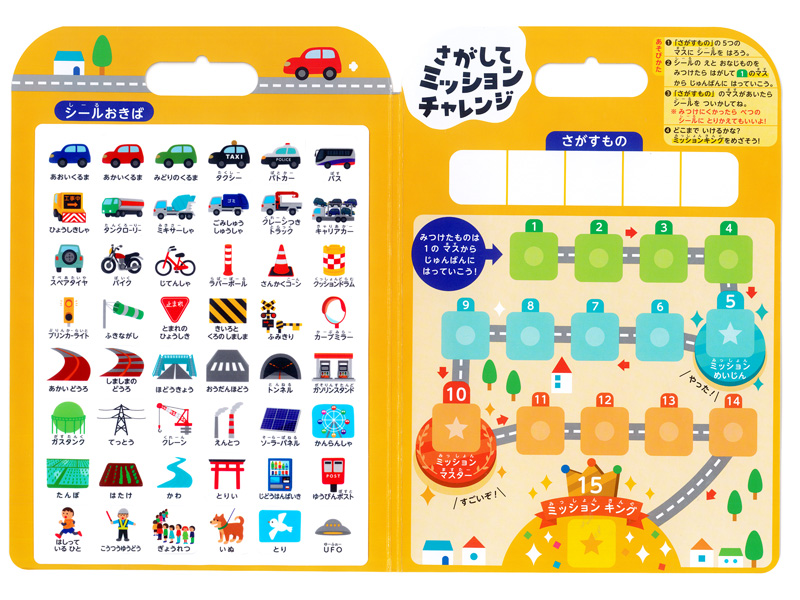 くるまでのお出かけの時間をもっと楽しく♪知育玩具『さがしてミッション・くるまでおでかけ』が登場。(1)「さがすもの」の5つのマスにシールを貼ろう。(2)シールの絵と同じものを見つけたらはがして1のマスから順番に貼っていこう!(3)「さがすもの」のマスがあいたらシールを追加してね。(4)どこまでいけるかな?ミッションキングを目指そう!