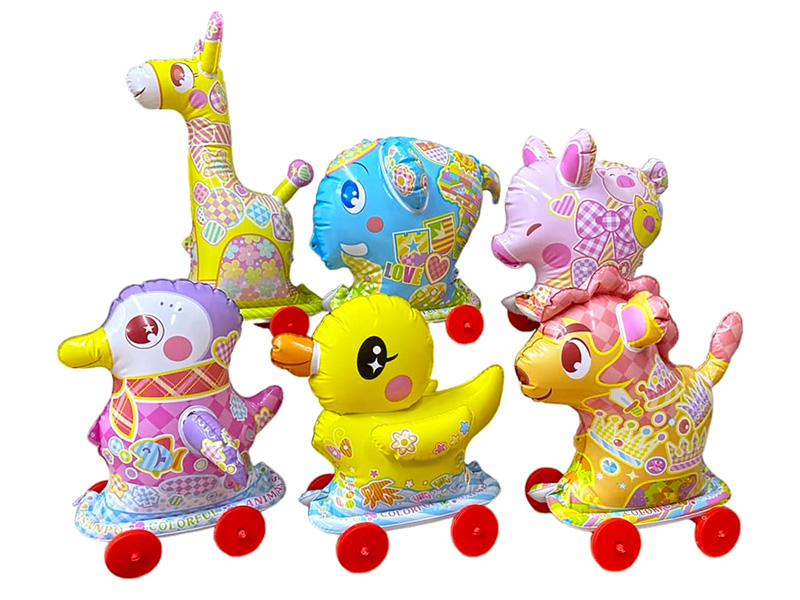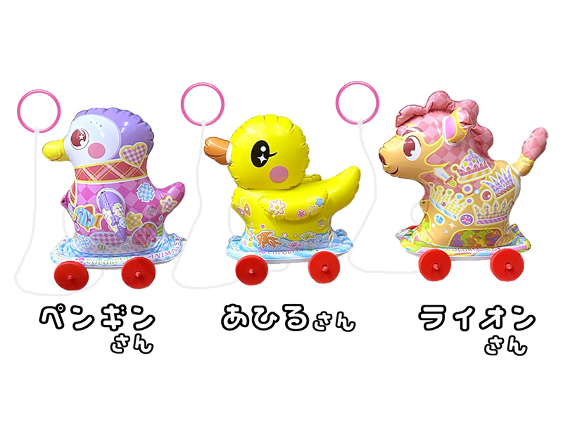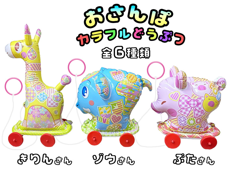 大人気のビニールおさんぽシリーズに「カラフルどうぶつ」が登場!様々などうぶつが6種類セットになっています!膨らんだビニールの本体に付属の4つのコマを取り付け、ひもを引っ張ってコロコロと進むので一緒にお散歩することができます!