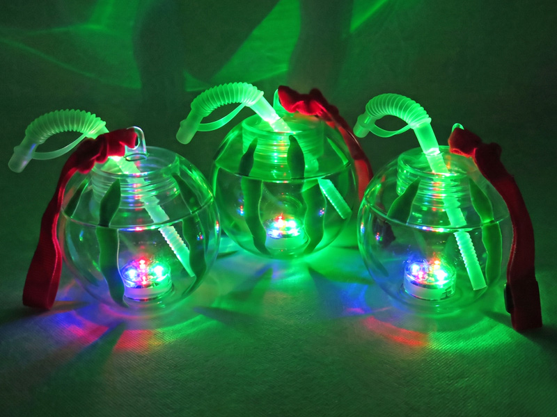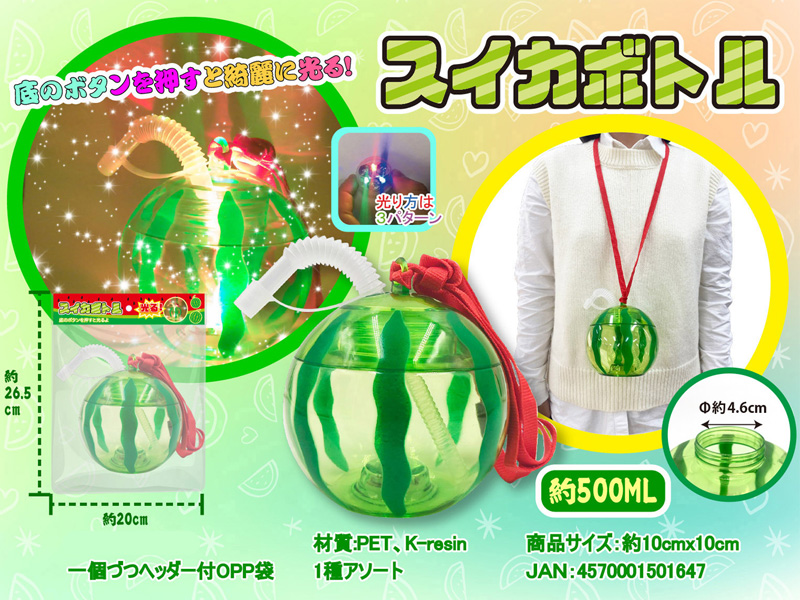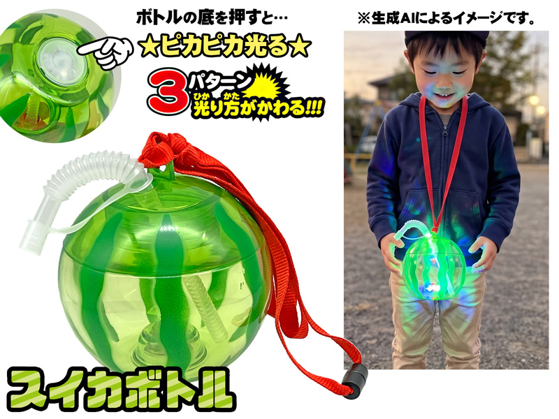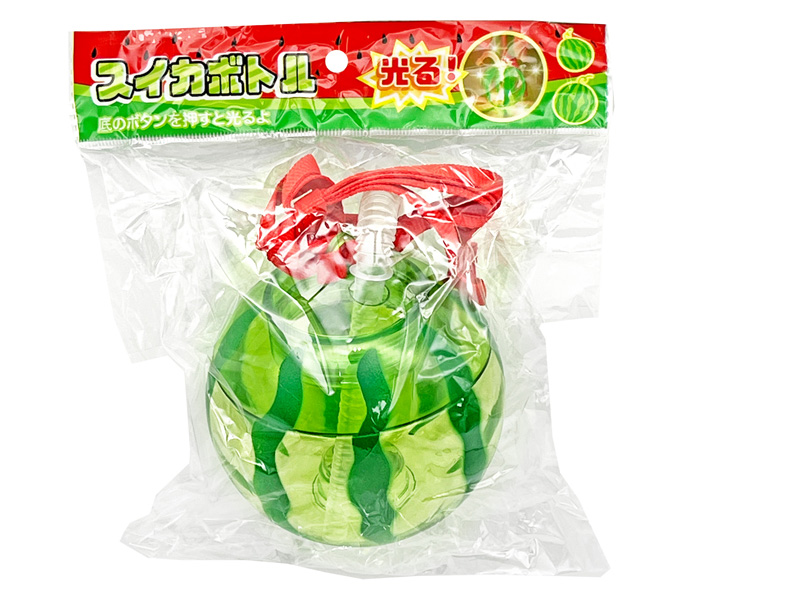夏の祭り・イベントにピッタリ!!光る色つきスイカボトルがお値打ち価格になって登場~♪ボトルのオシリを押してライトON!ドリンク全体が光に照らされてとってもキレイ☆☆彡 首から下げて使えるネックストラップ付もついているので、夏のお祭りやイベント会場で目立つこと間違いなしです。