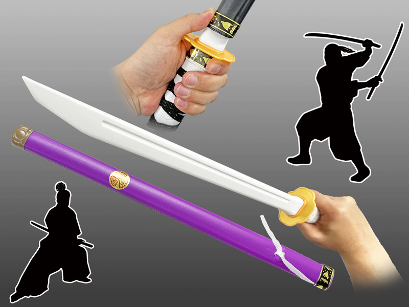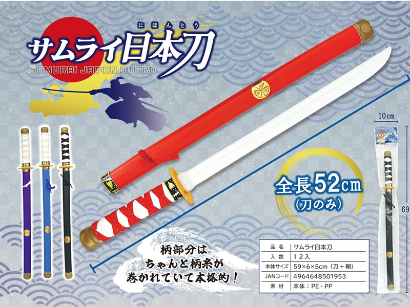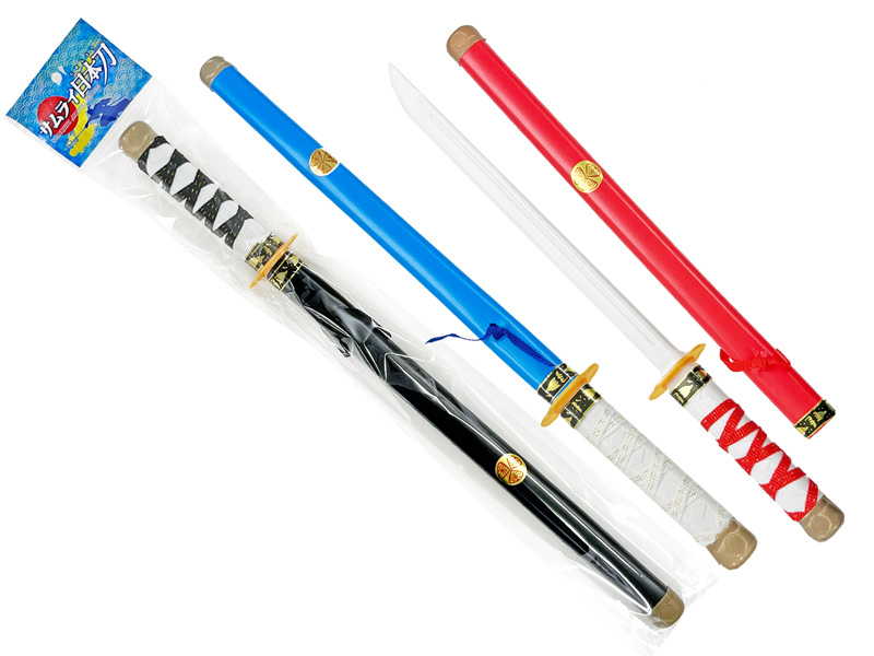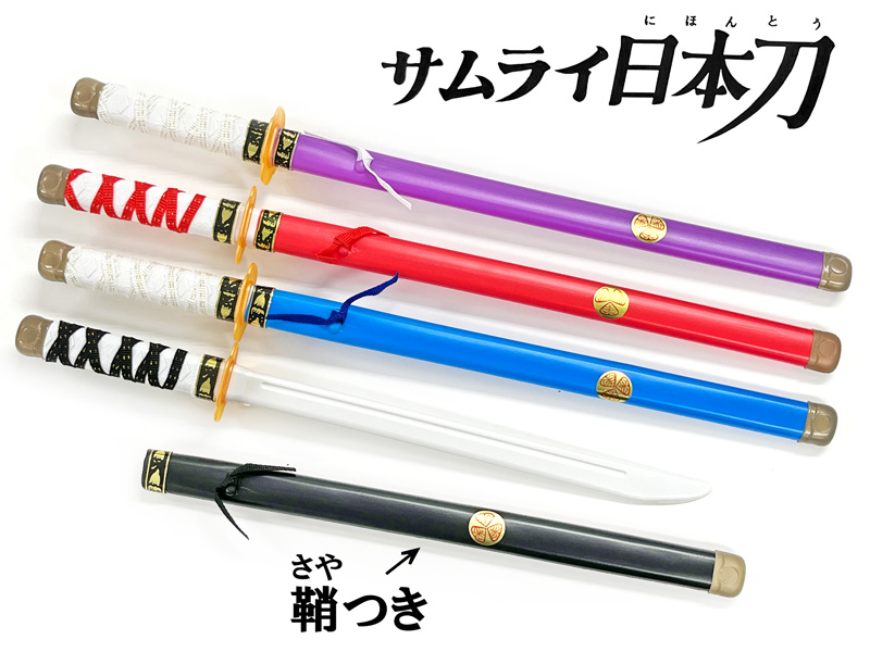 プラスチック素材のカッコいい日本刀のおもちゃです。鞘付きで、ちゃんと鞘から刀が抜くことができます。鞘の色は全4色!日本男児ならこれを貰って喜ばないワケがありません!お祭り・縁日、その他各種イベントの男の子向け景品玩具にゼヒ!
