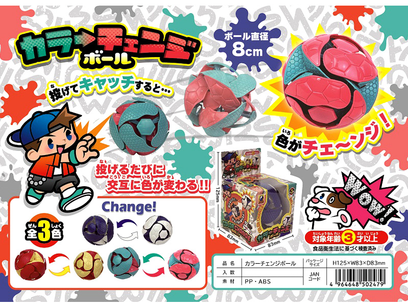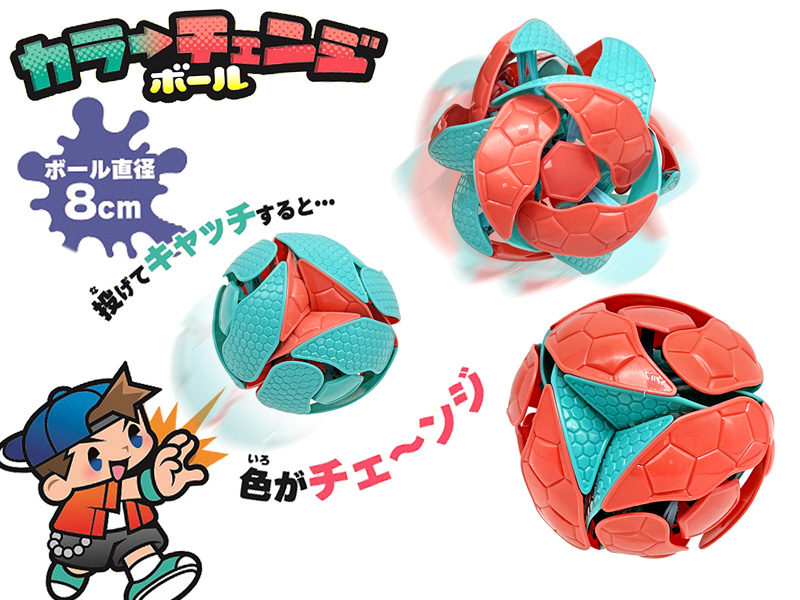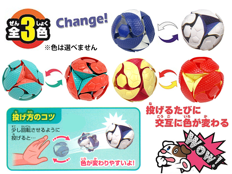 投げてキャッチすると…あら不思議!?色が変わっちゃう!その名も『カラーチェンジボール』が登場!少し回転を加えながらボールを宙に投げると色が反転!…(投げるたび交互に変わります) ボールの色は全3色。お祭りや各種イベントの景品玩具などにオススメです。