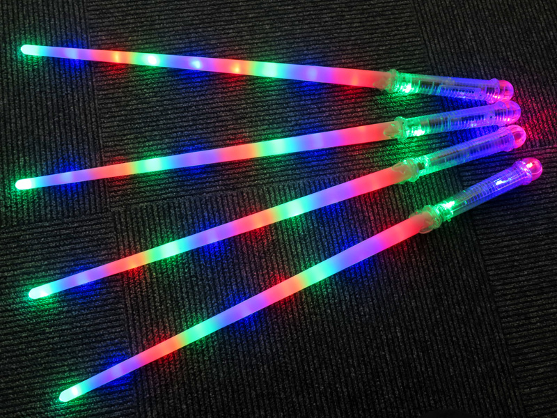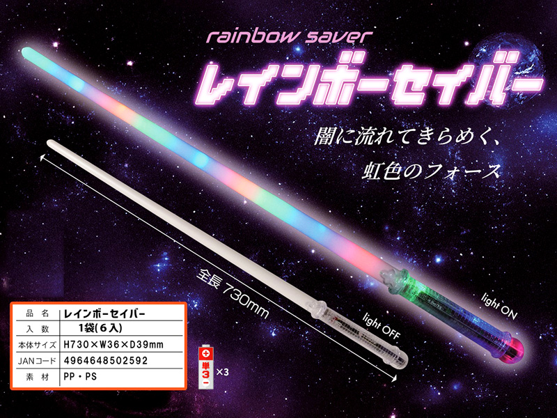 暗闇に流れてきらめく虹色のフォース!光るおもちゃ『レインボーセイバー』が登場!持ち手のボタンを押しますと全体が赤・青・緑にピカピカ光る!※続けてボタンを押すことで光のパターンが3回変化します。夏のイベントお祭り等の光る玩具にゼヒ!