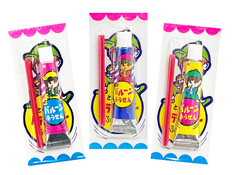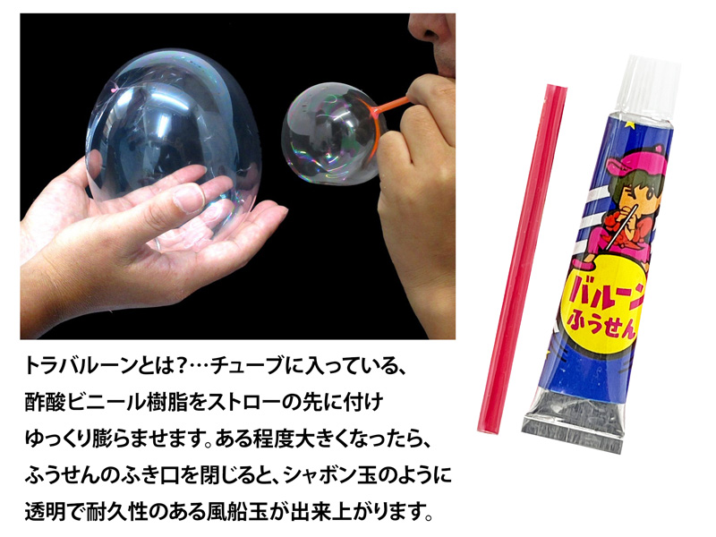 シャボンのようでシャボンでない!?昭和の時代からある不思議なおもちゃ…台紙付き「トラバルーン」が登場!遊び方はまず、チューブ内のジェル状の物体(酢酸ビニール樹脂)をストローの先に付けてゆっくり膨らませます。ある程度大きくなったら、ふうせんのふき口を閉じると、シャボン玉よりも耐久性のある風船玉が出来上がります!
