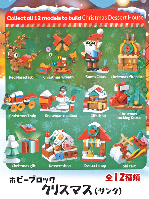 色々な乗り物や動物を作って楽しめる人気の「ホビーブロックシリーズ」にクリスマスバージョンが登場~!付属を図面を参考に組上げると…Xmasモチーフのキャラクターが完成!またブロック全12種類を合体させると、大きな作品(お菓子の家)をつくることができます♪クリスマスイベント等の景品玩具にオススメです。