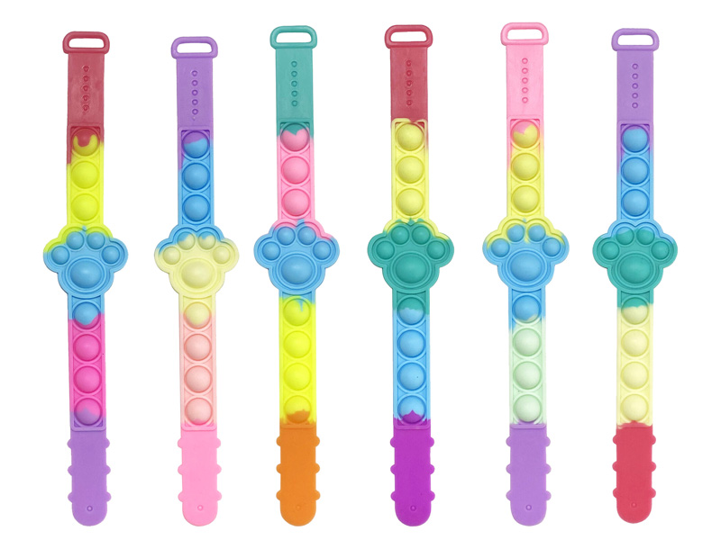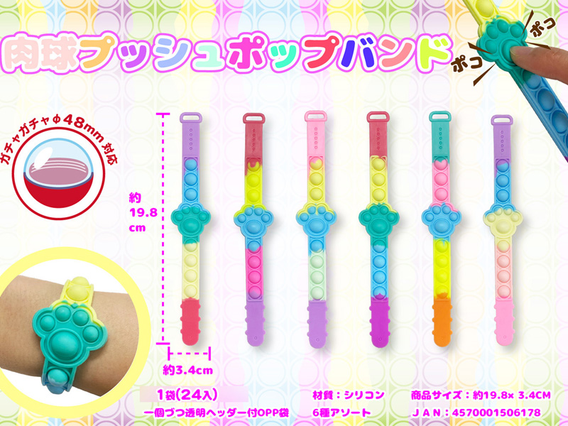 人気のプッシュポップがブレスレットになって登場!こちらは肉球モチーフのキュートなシリコン素材のプッシュポップバンド!腕にクルっと巻きつけて持ち歩くこともできます。本体カラーは全6種類!本体は個別包装されていますので、イベントの販促品やガチャガチャのカプセルトーイなどにもオススメです。