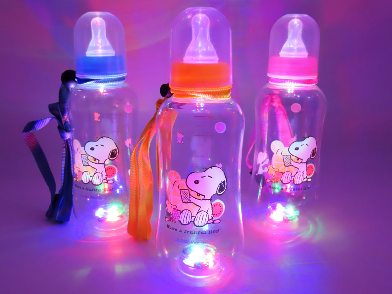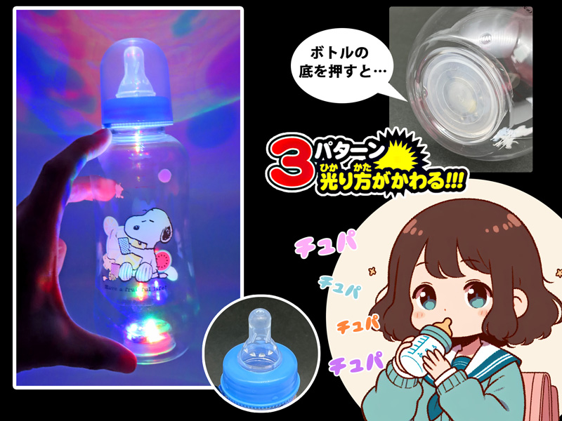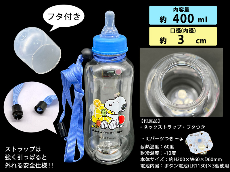 大人気の光る哺乳瓶ボトルに【スヌーピー】デザインが登場~♪こちらのボトルは、飲み口がシリコン素材になっているので、赤ちゃんみたいにちゅぱちゅぱ吸って飲むことができます♪明るい時間は 哺乳瓶デザインで楽しく!夜イベントでは ピカピカと光るボトルで楽しく!お祭りや夜のイベントには欠かせません!飲み物の容器は、品揃え・在庫も豊富な堀商店にお任せください!!