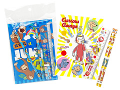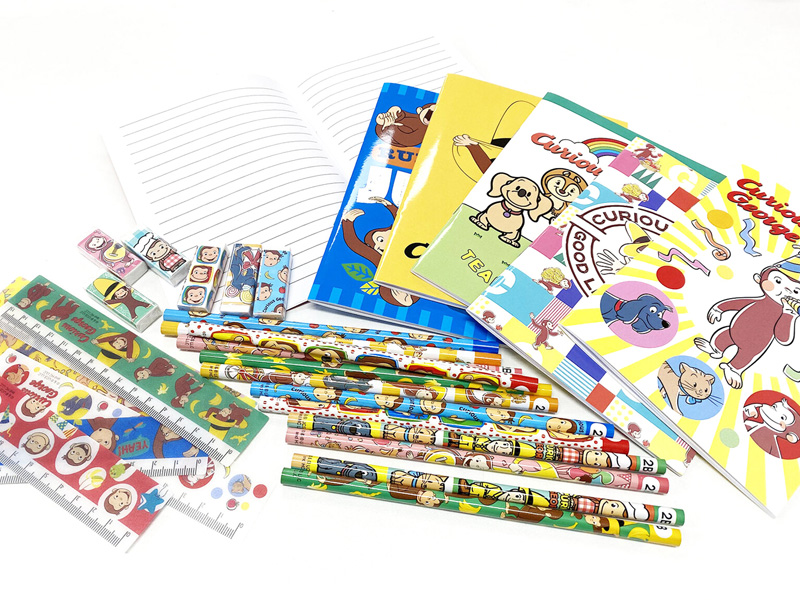 人気キャラクターの絵柄がうれしい♪おさるのジョージの「BIGメモ5点文具セット」が登場です。袋の中には罫線付きのノート・鉛筆×2・消しゴム・15cm定規が入っています。文具のデザインは全部で6種類♪お祭り・縁日、その他各種イベントにはモチロン、飲食店さん向けのランチ景品にもオススメです。