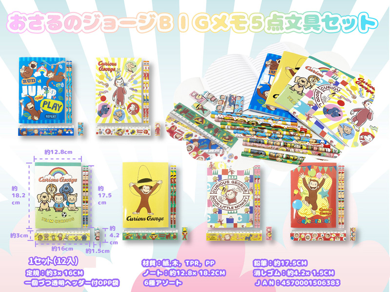 100景品 おさるのジョージ BIGメモ 5点文具セット