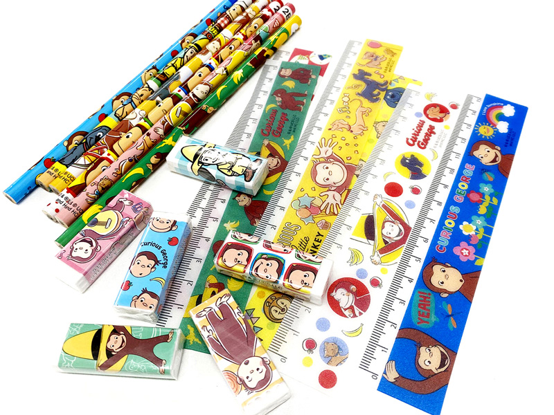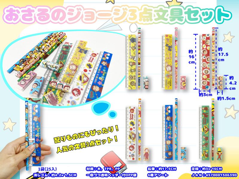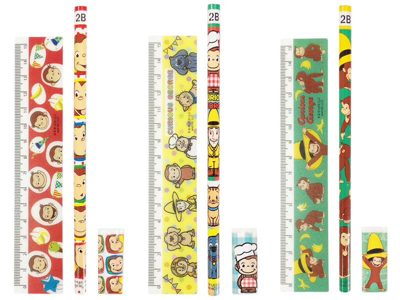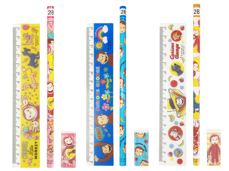世界中で愛されている絵本のキャラクター【おさるのジョージ】の3点文具セットが登場。袋の中には鉛筆・消しゴム・15cm定規が入っています。楽しい絵柄は全部で6種類♪低単価の販促・ノベルティ景品などにゼヒ!