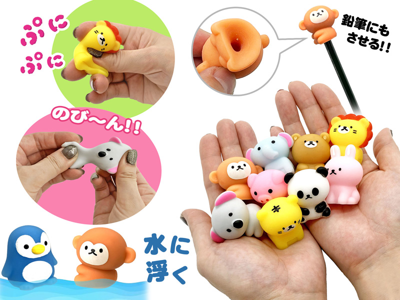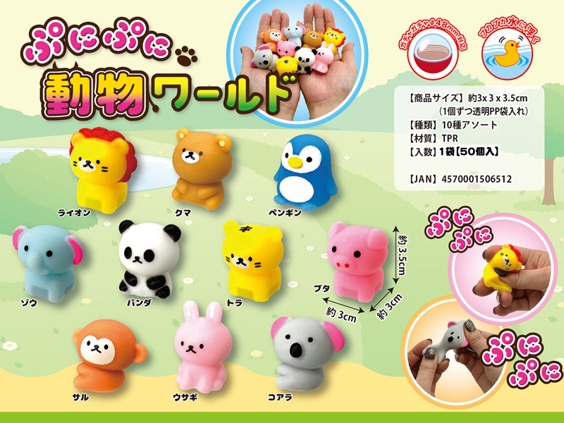 「動物」デザインのやわらかマスコット「ぷにぷに動物ワールド」が登場♪人形は触り心地もぷにぷに柔らか~♪水にも浮きますのでお祭りのすくい人形、浮かし景品などにもご使用いただけます。