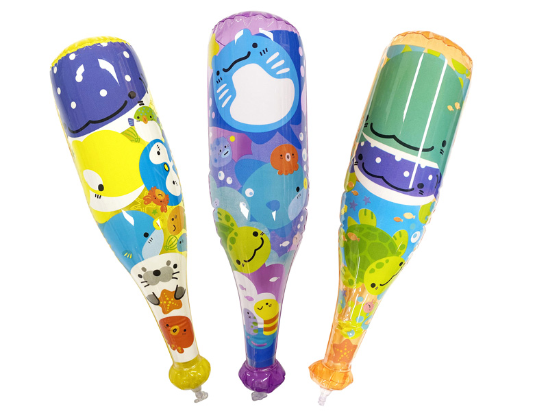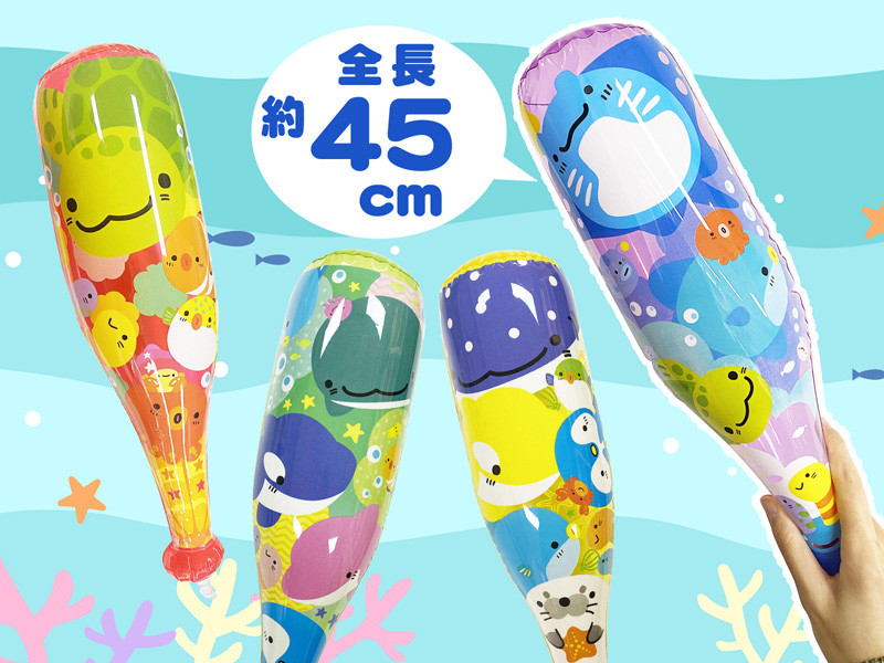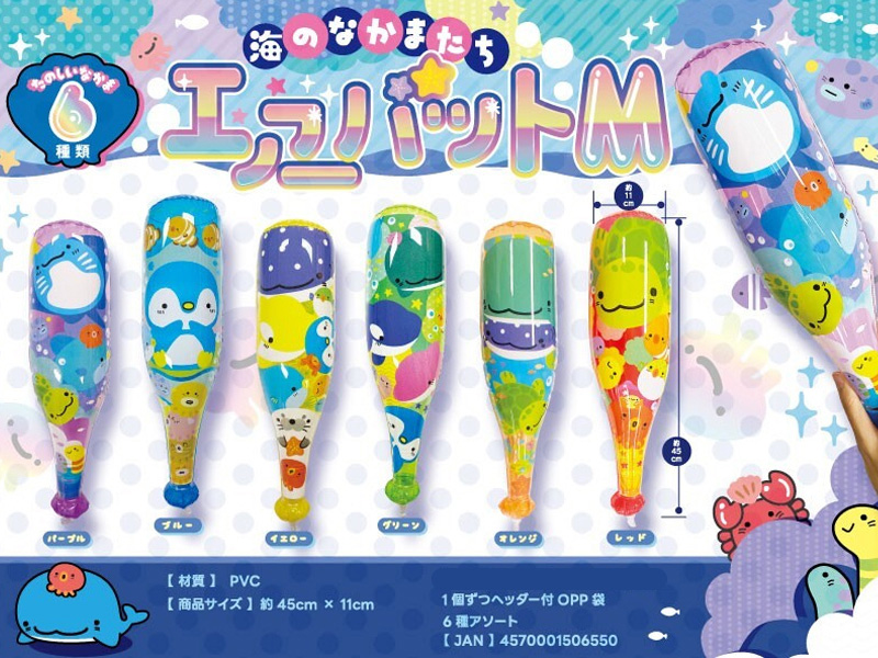 【海のなかまたち】のビニールバットが登場!膨らませた大きさは約45センチ前後とお子様も持ちやすいサイズ。バットに描かれたイラストは全部で6種類!夏の縁日・お祭り・イベントの目玉景品に大変オススメですよ。
