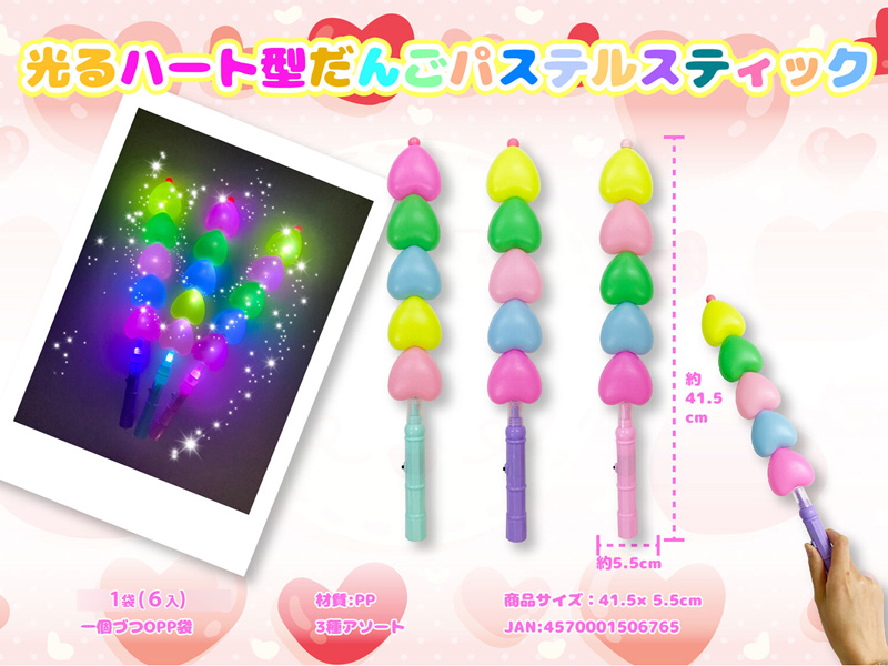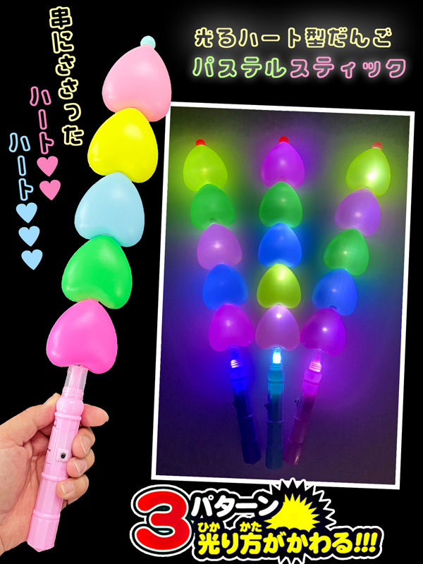 全長約40㎝!串にささったお団子みたいな見た目の『光るハート型だんごパステルスティック』が登場~♪スイッチを押しますと、5つのハートがピカピカと光ります(光り方は全3パターン)本体カラーは全3色。お祭り・縁日、その他各種イベントの女の子向けの光るおもちゃにゼヒ!