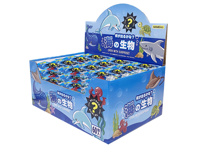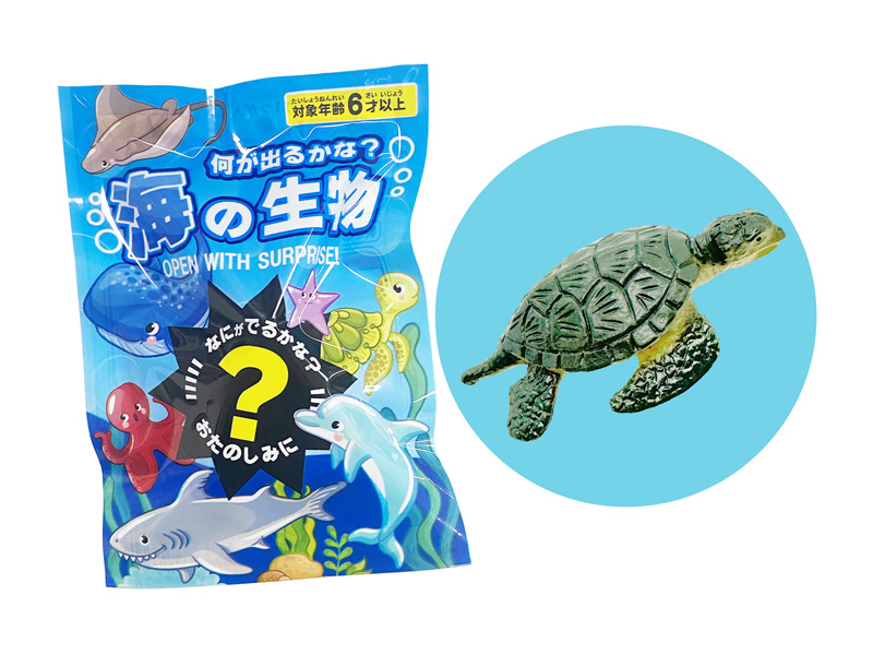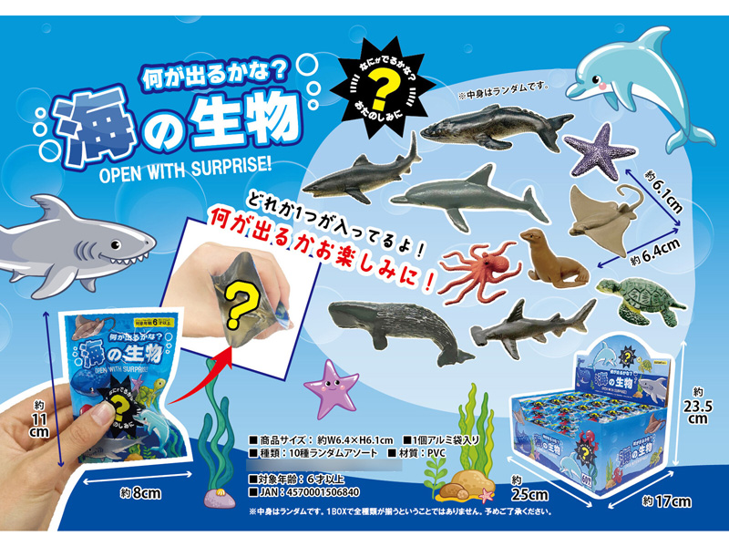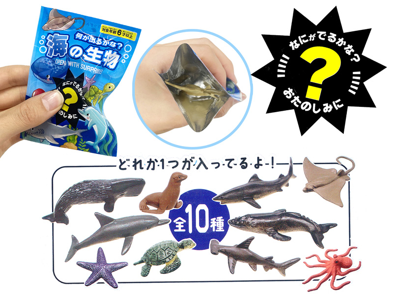 中身の見えないブラインドのパッケージの封を開けると…イルカやサメなどの海の生き物のリアルマスコットが1体入っています!海洋生物のマスコットは全10種類。中にどの生物が入っているかは空けてからのお楽しみです!