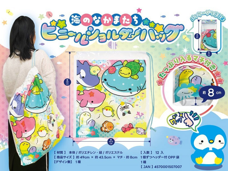 全長約49cm「海のいきもの」がモチーフのかわいいショルダーバッグが登場!マチ幅が8cmありたっぷり収納!バッグの口をキュっとしめ、肩から下げて持ち運ぶこともできます。商品は個別包装されておりますので、夏のイベントの景品・サマーグッズなどにオススメです。
