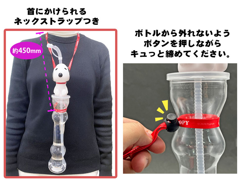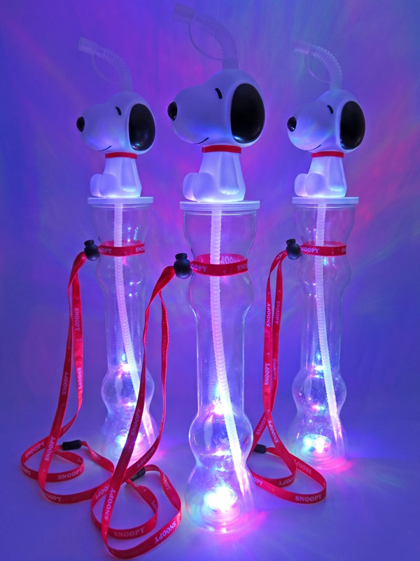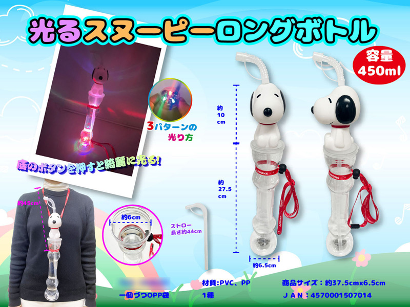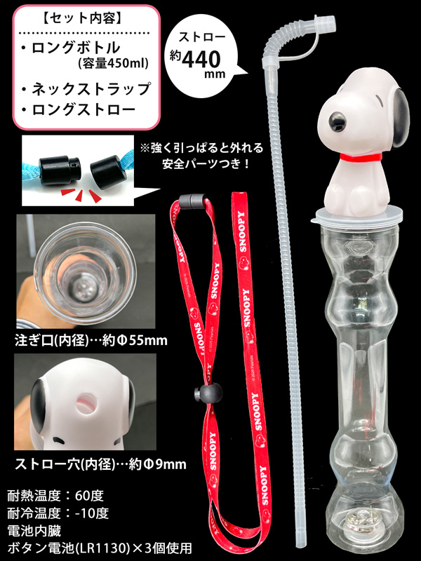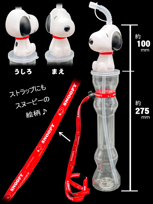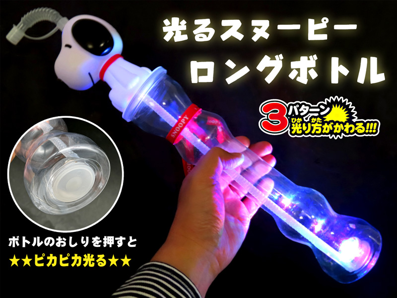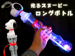 全長約37㎝!【スヌーピー】のかわいい光るキャラクターロングボトルが登場~♪♪ボトルのオシリを押してライトON!ドリンク全体が光に照らされてとっても幻想的です。首から下げて使えるネックストラップ付もついているので、夏のお祭りやイベント会場で目立つこと間違いなしです。