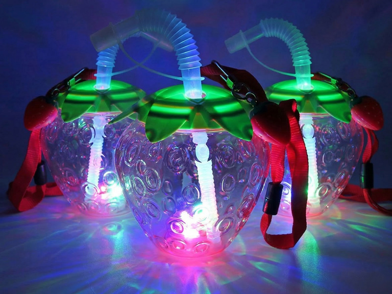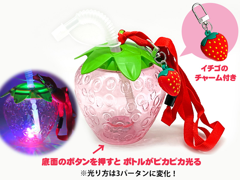 いちごのチャームがとってもキュート!かわいい色付きの光るいちごボトルが登場~♪♪ボトルは底にあるスイッチを押すごとに光り方が3パターンに変わります。首からぶら下げられるストラップ付!夏祭りやイベントで大人気間違いなしです。光るドリンクボトル・飲み物の容器は、品揃え・在庫も豊富な堀商店にお任せください!!