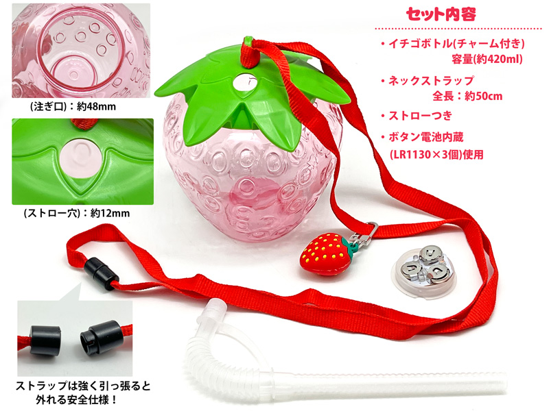- セット内容:イチゴボトル(チャーム付き)×1・ストロー×1・ネックストラップ×1