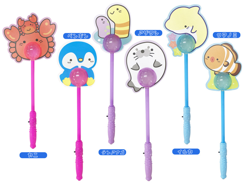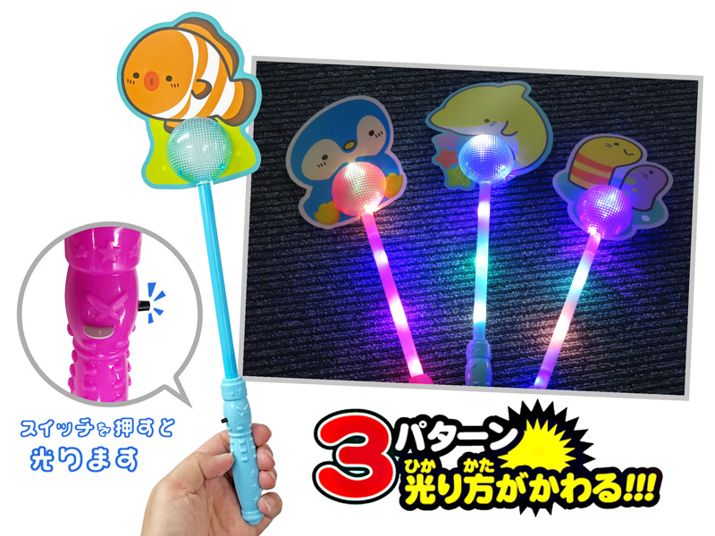 全長約39cm「海洋生物」がモチーフのかわいい光るスティックが新登場~☆☆彡 持ち手のボタンを押すとスティック全体がピカピカ光る!ボタンを押すごとに点滅パターンが変化します(全3パターン)海の生き物は全6種類!夏のお祭りや各種イベントの光る玩具・景品などにオススメです。