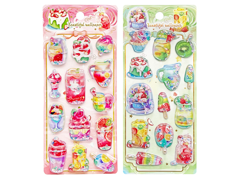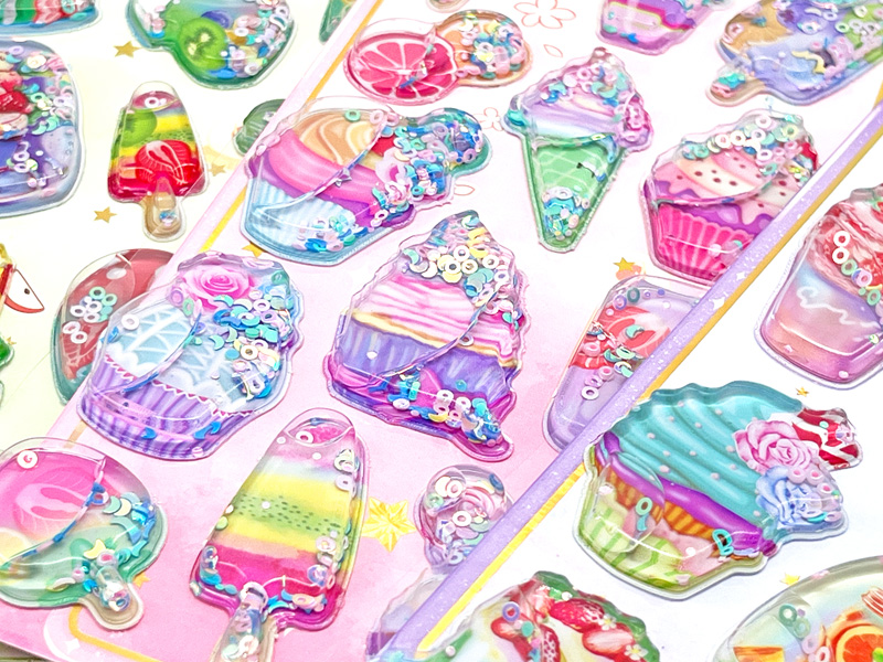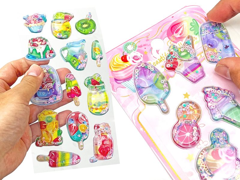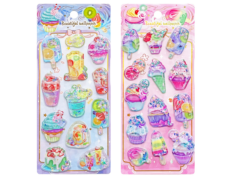 振るとをチャプチャプ音がする!今話題の立体3DシールにのNEWバージョンが登場!こちらは…立体的なカプセルの中に水とスパンコール、ビーズなどを閉じ込めたウォーターinシール♪動くたびに中身がキラキラと動きます。かわいいスイーツモチーフのシールは全4種アソート。女の子向けのご褒美景品やプチギフトにもおすすめです!