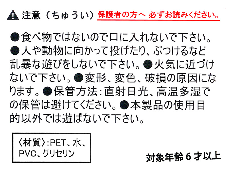 - 素材:PET、水、PVC、グリセリン、