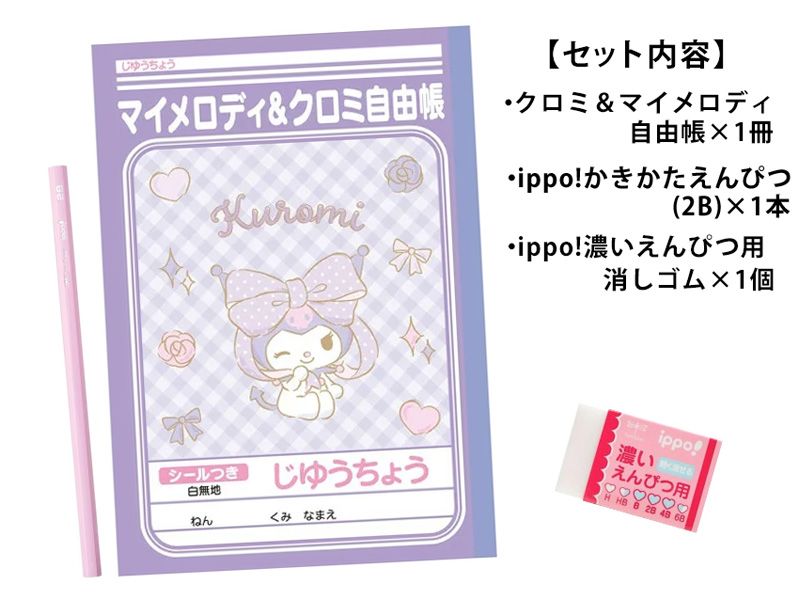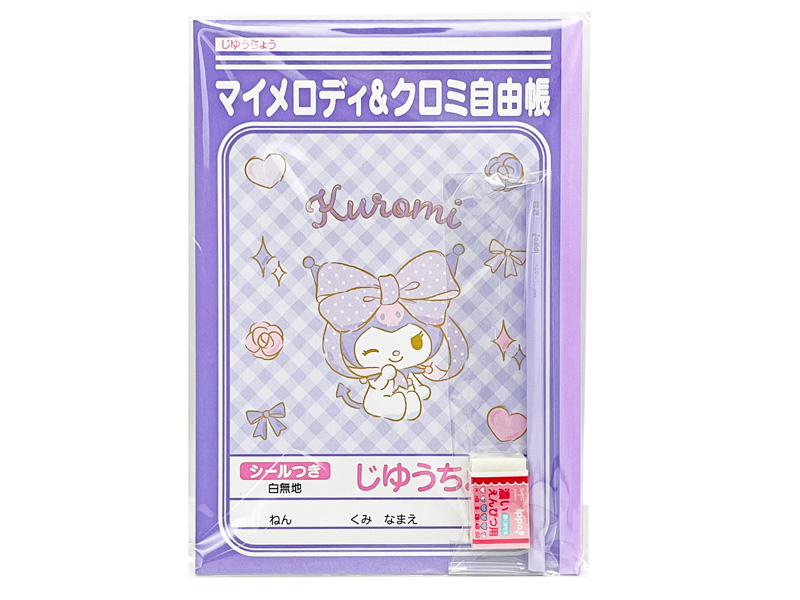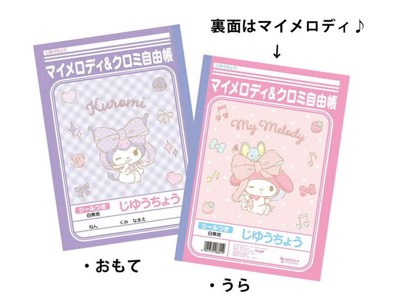 サンリの人気キャラ「クロミ&マイメロディ」のリバーシブルな表紙が可愛らしいステーショナリー文具セットが誕生~♪OPPの袋の中には、自由帳に2B鉛筆・学習用消しゴムの3点が入っています。大好きなキャラクターと一緒なら勉強もはかどっちゃうかも♪♪進級・新入学・卒園のお祝い・記念品などのプレゼントにも喜ばれそうなキャラクターグッズです☆