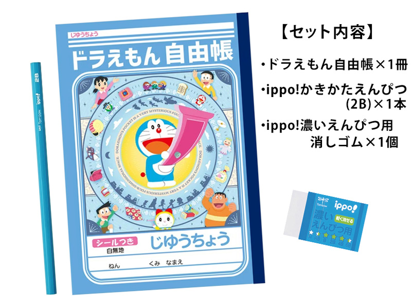 とっても大好き♪「ドラえもん」のステーショナリー文具セットが誕生~♪OPPの袋の中には、自由帳に2B鉛筆・学習用消しゴムの3点が入っています。大好きなキャラクターと一緒なら勉強もはかどっちゃうかも♪♪進級・新入学・卒園のお祝い・記念品などのプレゼントにも喜ばれそうなキャラクターグッズです☆