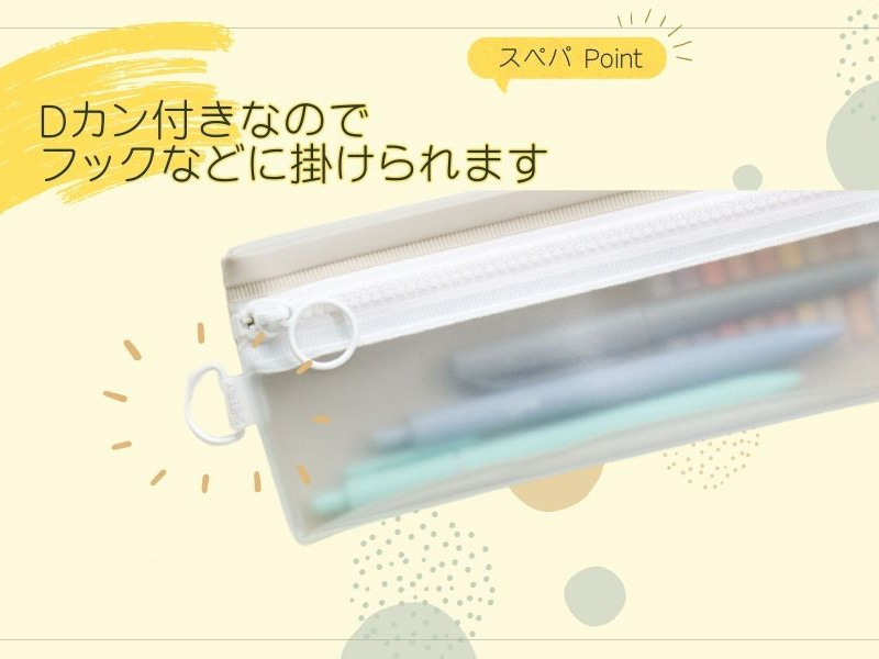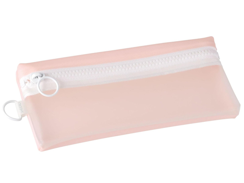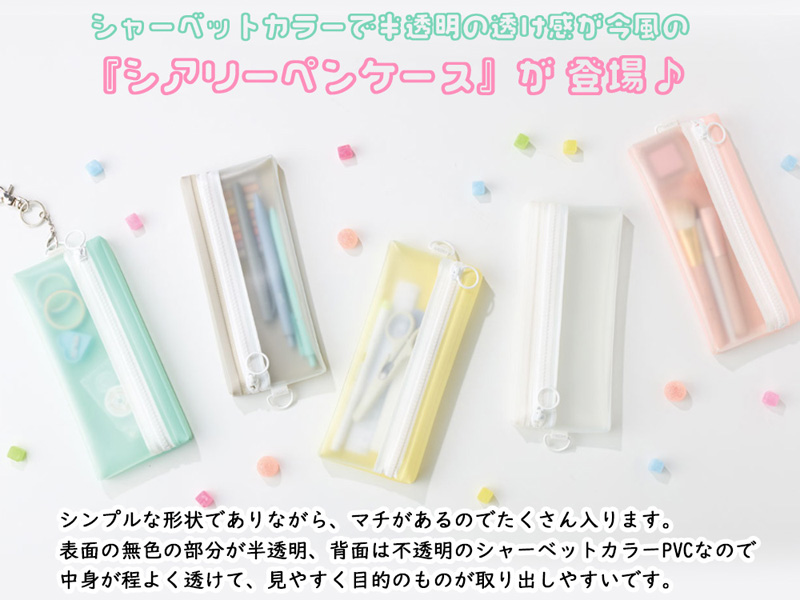 うっすら見える透け感が今風な「シアリーペンケース」が登場♪ シンプルな形状でありながら、マチがあるのでたくさん入ります。表面の無色の部分が半透明、背面は不透明のシャーベットカラーPVCなので中身が程よく透けて、見やすく目的のものが取り出しやすいです。リング型の引き手とDカンが付いているのでチャームなども付けやすく、自分好みにアレンジもできます。