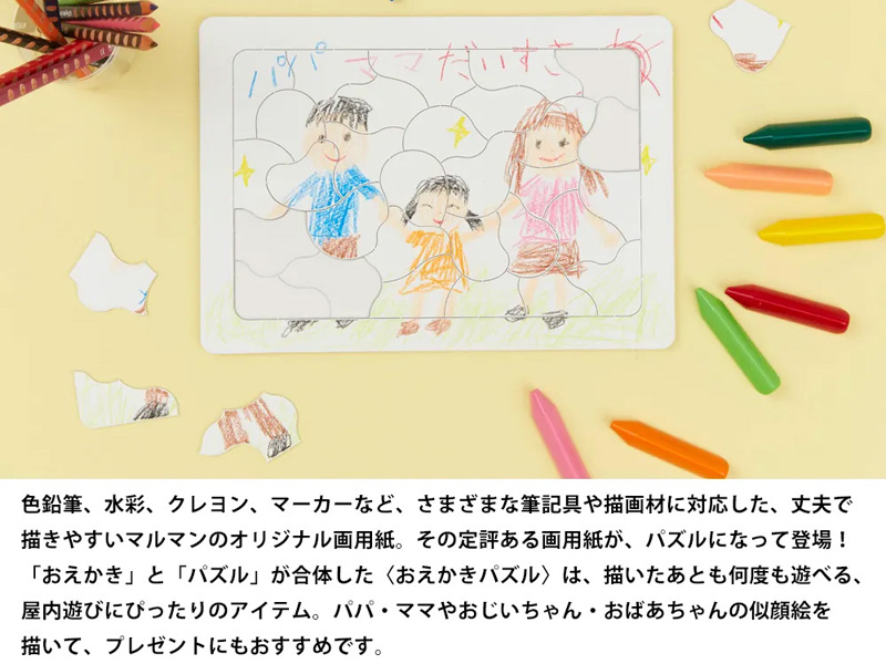 「おえかき」と「パズル」が一緒に楽しめる!図案スケッチブックの画用紙と同じ素材でできたパズル『B4おえかきパズル/60ピース』が登場!!パズルピースは並口画用紙を使用しているので、色鉛筆やクレヨンはもちろん、マーカーペンに水彩絵具でも、おえかきを楽しめます。「おえかき」と「パズル」が合体した〈おえかきパズル〉は、描いたあとも何度も遊べる、屋内遊びにぴったりのアイテム。パパ・ママやおじいちゃん・おばあちゃんの似顔絵を描いて、プレゼントにもおすすめです。
