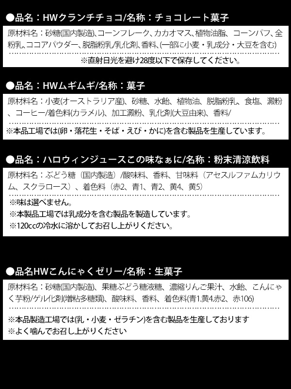 - セット内容:雑貨(スカルボトルストラップ付)×1・ジャックのミニマスコット×1) お菓子(HWこの味なぁに(粉末ジュース)×1・HWフエラムネ×1・HWクランチチョコ×1・HWこんにゃくゼリー×1・HWムギムギ×1・HWウエハース×1)