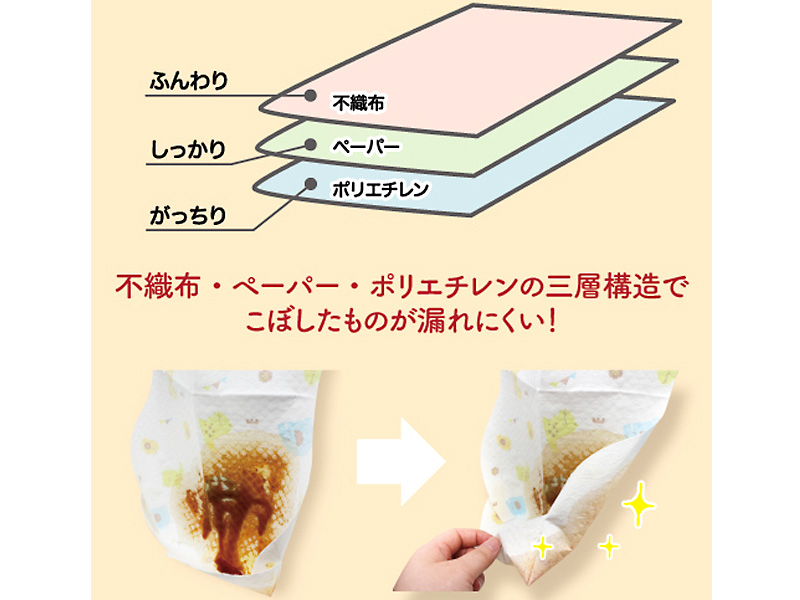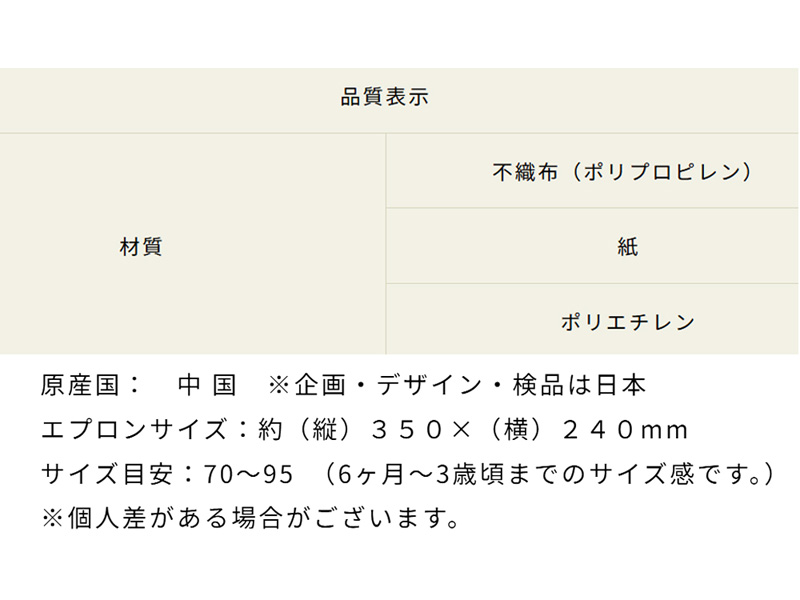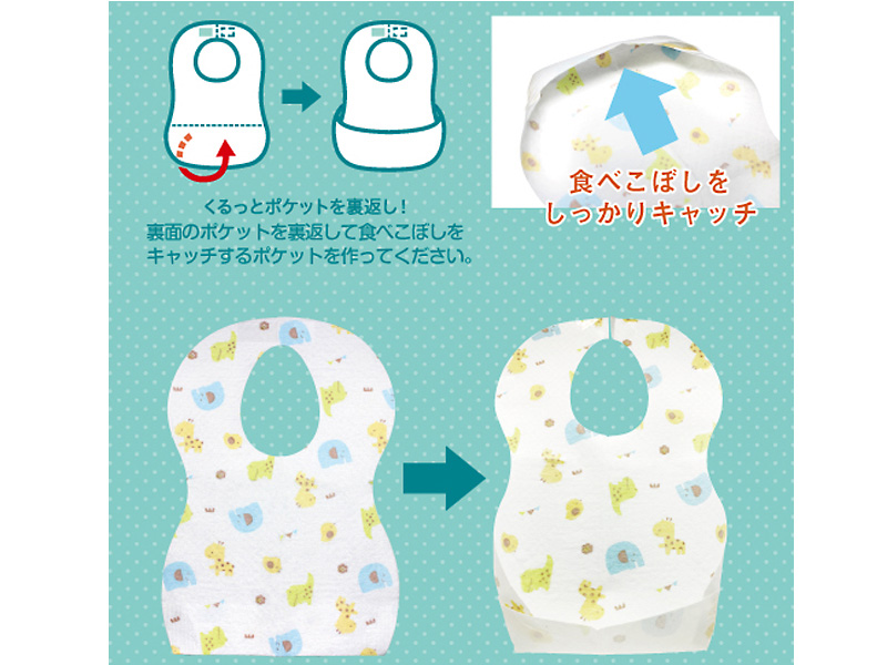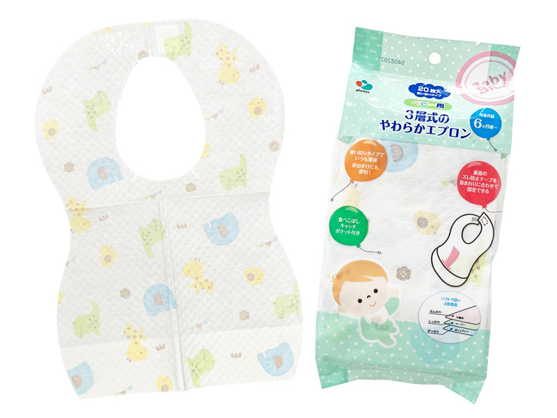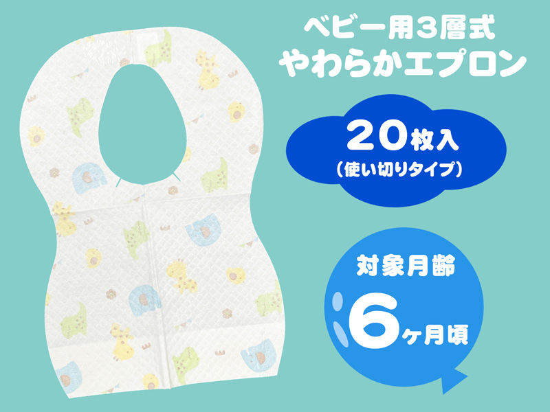 厚みがあってソフトな肌触り!使い切りタイプでいつも清潔!!柔らかい肌触りで使い切りタイプのベビー用エプロンです。表地は不織布、中地はペーパー、裏地はポリエチレンの順に3層構造なので液状のもので裏地(服)にしみることなくしっかりガード!・首周りにはスリットが入っているので圧迫感なく着用でき、ズレ防止テープでお子様の首周りに合わせて調整できます。「チクチクして嫌がる…」というお子様におすすめです♪