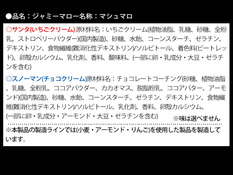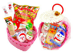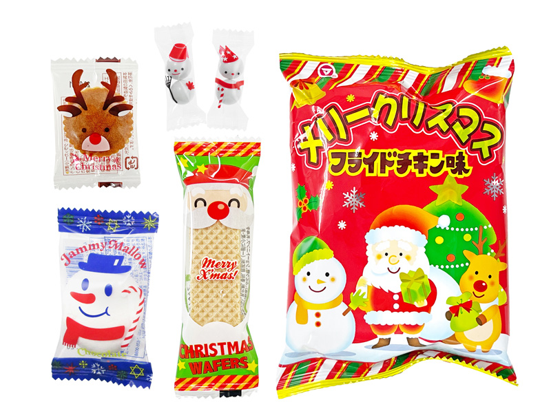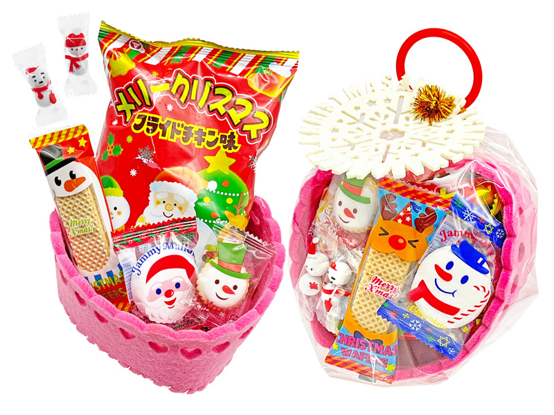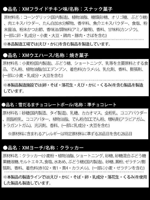 - セット内容…雑貨(ハートトレイ×1・フェルトコースター×1) お菓子(・メリークリスマスフライドチキン×1・ジャミーマロ(サンタorスノーマン)×1・XMヨーチ×1・XMウエハース×1・雪だるまボールチョコ×2)