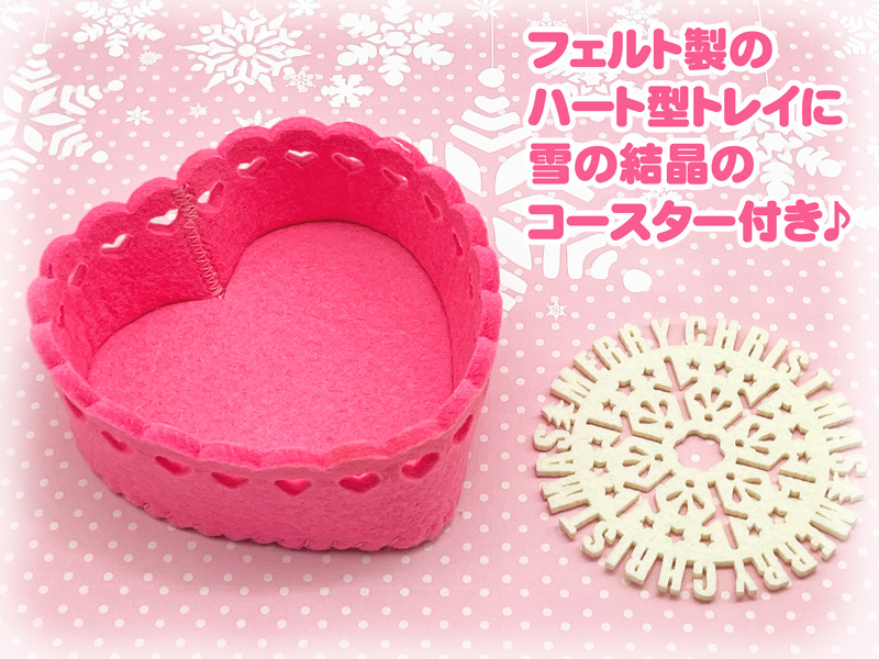 ハートをあなたにあげる♪ハート型の容器を使用したキュートなクリスマスギフトが新登場~♪雪の結晶のカタチをしたフェルトコースターにクリスマスパッケージの楽しいお菓子が5種類もはいってる!クリスマスのギフトにはモチロンのこと、日頃の感謝の気持ちを伝えるプレゼントや贈り物にいかがでしょうか?