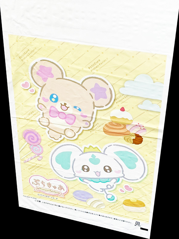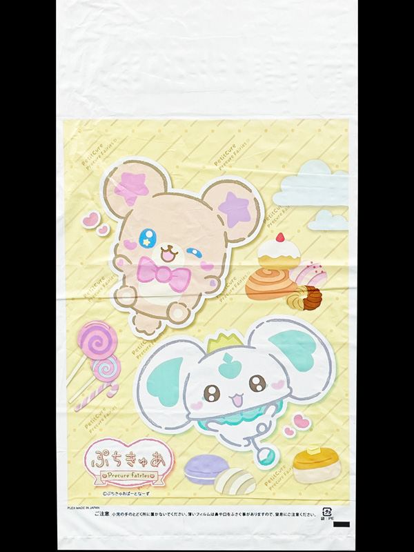アニメ『プリキュアシリーズ』のスピンオフWebショートアニメ…【ぷちきゅあ(おかしなパラダイス)】のわたがし袋が登場!!すごく薄いので、わたがし以外の物を入れたい場合は、かなり軽い物以外は入れないほうが良いですよ。