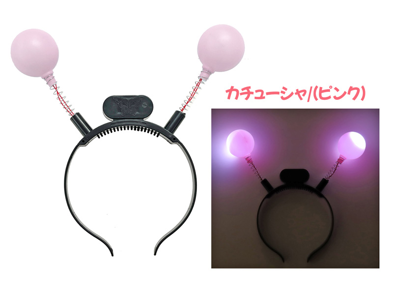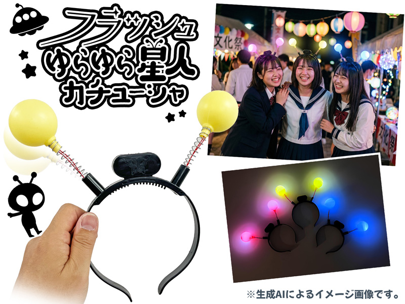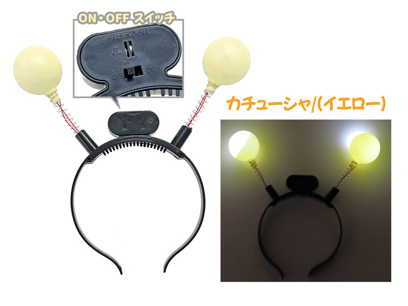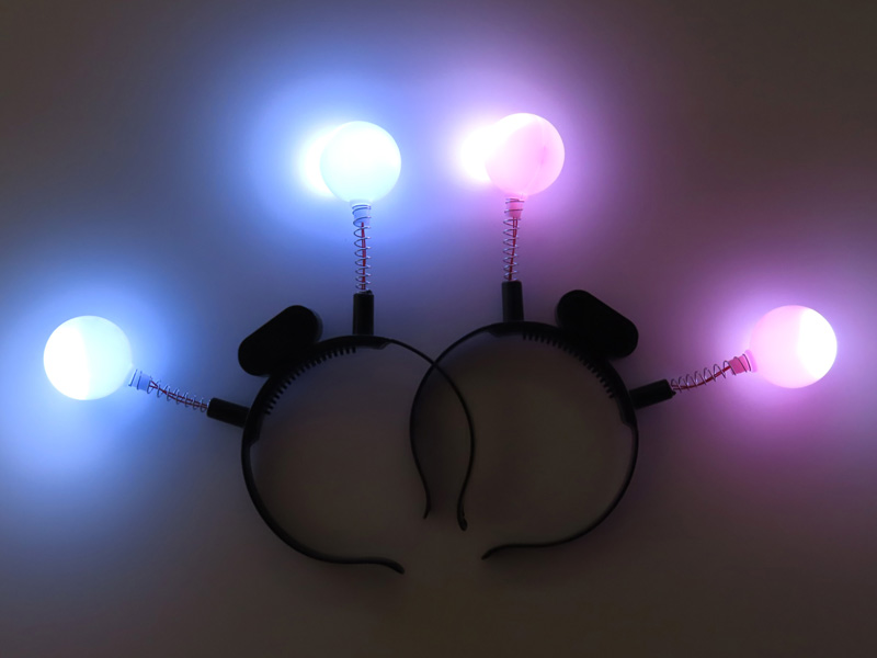 つければ宇宙と交信できちゃうかも!? 頭のボールが光って、ゆらゆら揺れる、まるで宇宙人な光るカチューシャが登場♪スイッチのON/OFF切り替えで先端のボールがピカピカ光るヨ。光っていない昼間はパステルカラーが可愛いカチューシャに♪お祭り・縁日イベントの光るおもちゃ景品にはモチロン、パーティーのプチ仮装・盛り上げグッズなどにもおすすめです