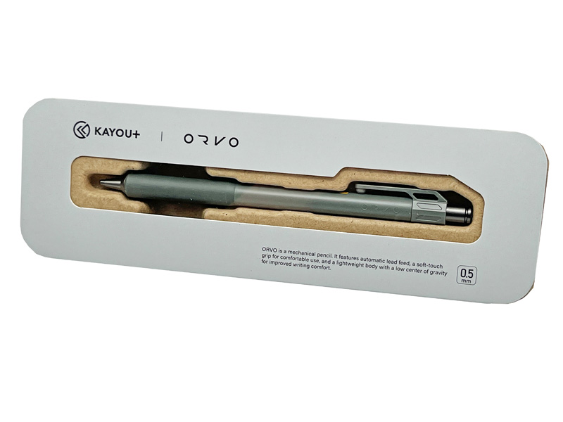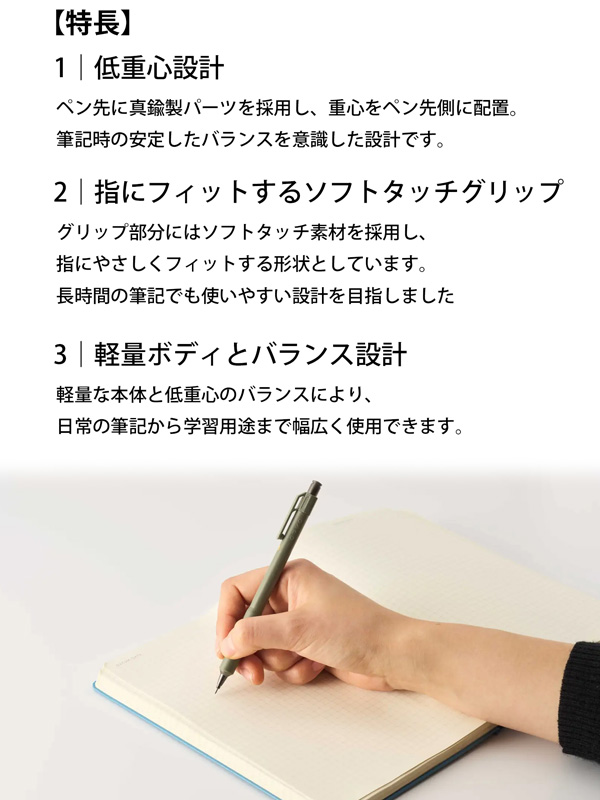 「ORVO」とは…実用性とデザイン性の両立を意識した高品質なシャープペンシルです。軽量な本体に対して真鍮製のペン先を採用し、低重心バランスとすることで、安定した筆記と扱いやすさに配慮しました。触感をしっかり感じられる大型グリップと、質感に配慮したデザインの両立を目指して設計しました。グリップ径をφ9.5mm、後軸をφ8.5mmとすることで、握った際の触感を感じやすくしながら、取り回しの良いバランスに整えています。軽量な本体と低重心のバランスにより、日常の筆記から学習用途まで幅広く使用できます。