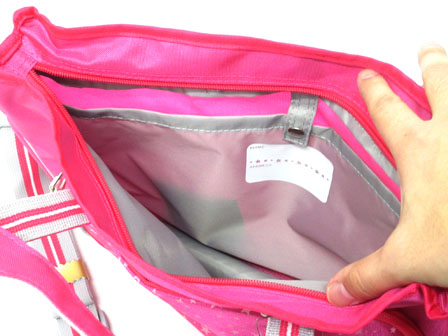 手持ちとショルダーの2通り使えるアディダス(adidas)セシルのレッスンバッグです。前面に星柄がプリントされた小物の収納に便利なファスナーポケット。引き手に星型のチャーム付き。メインルームはファスナー式で簡単に開閉。…本体内部背面側にボタンホック式オープンポケット。その前面に名前と住所を記入できるプリントのネームタグ付きです。