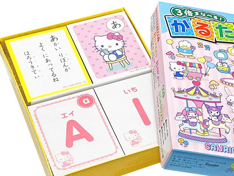 【サンリオキャラクターズ】より「かるた、数遊び、ABCカード」の3つの遊びができるカルタが登場~!人気キャラクターたちの絵札で、かるた遊びをしながら数字やアルファベットも自然に覚えられちゃうかも?!※「ひらがな表」の付録も付いています。冬休みに家族や友達と楽しくひらがなや数字のお勉強をしましょう♪